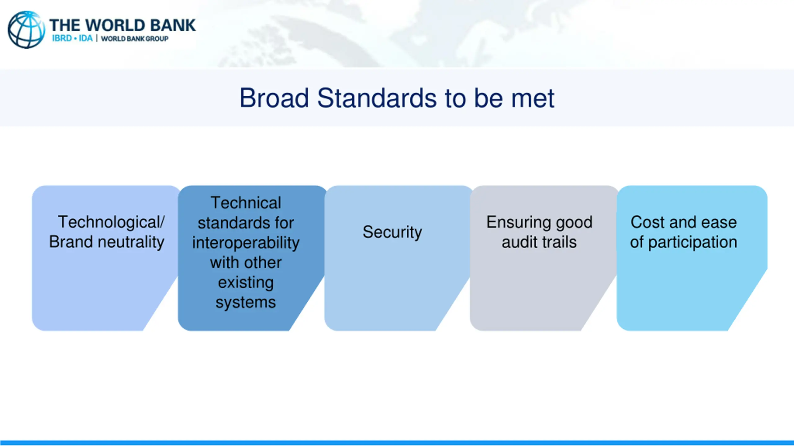 Broad Standards to be met Technical standards for interoperability with other existing systems Technological/ Brand neutrality Cost and ease of participation Ensuring good audit trails Security