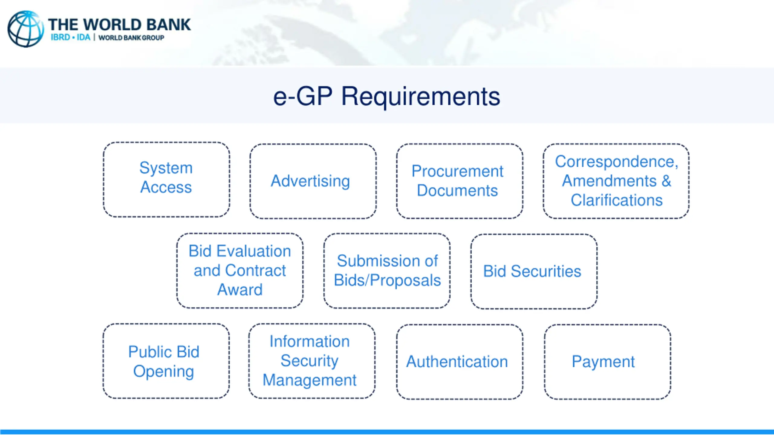 e-GP Requirements Correspondence, Amendments & Clarifications System Access Procurement Documents Advertising Bid Evaluation and Contract Award Submission of Bids/Proposals Bid Securities Information Security Management Public Bid Opening Authentication Payment