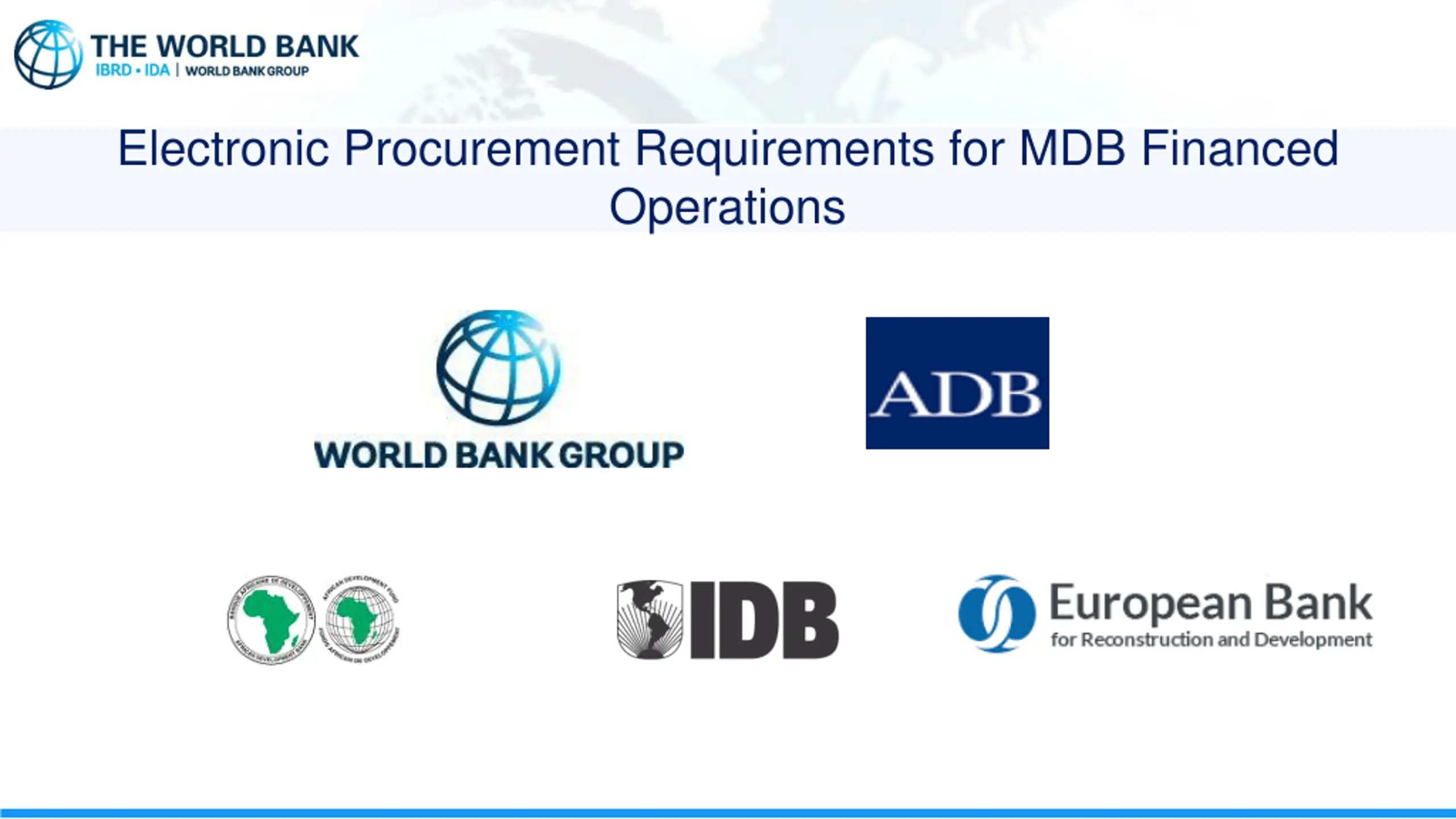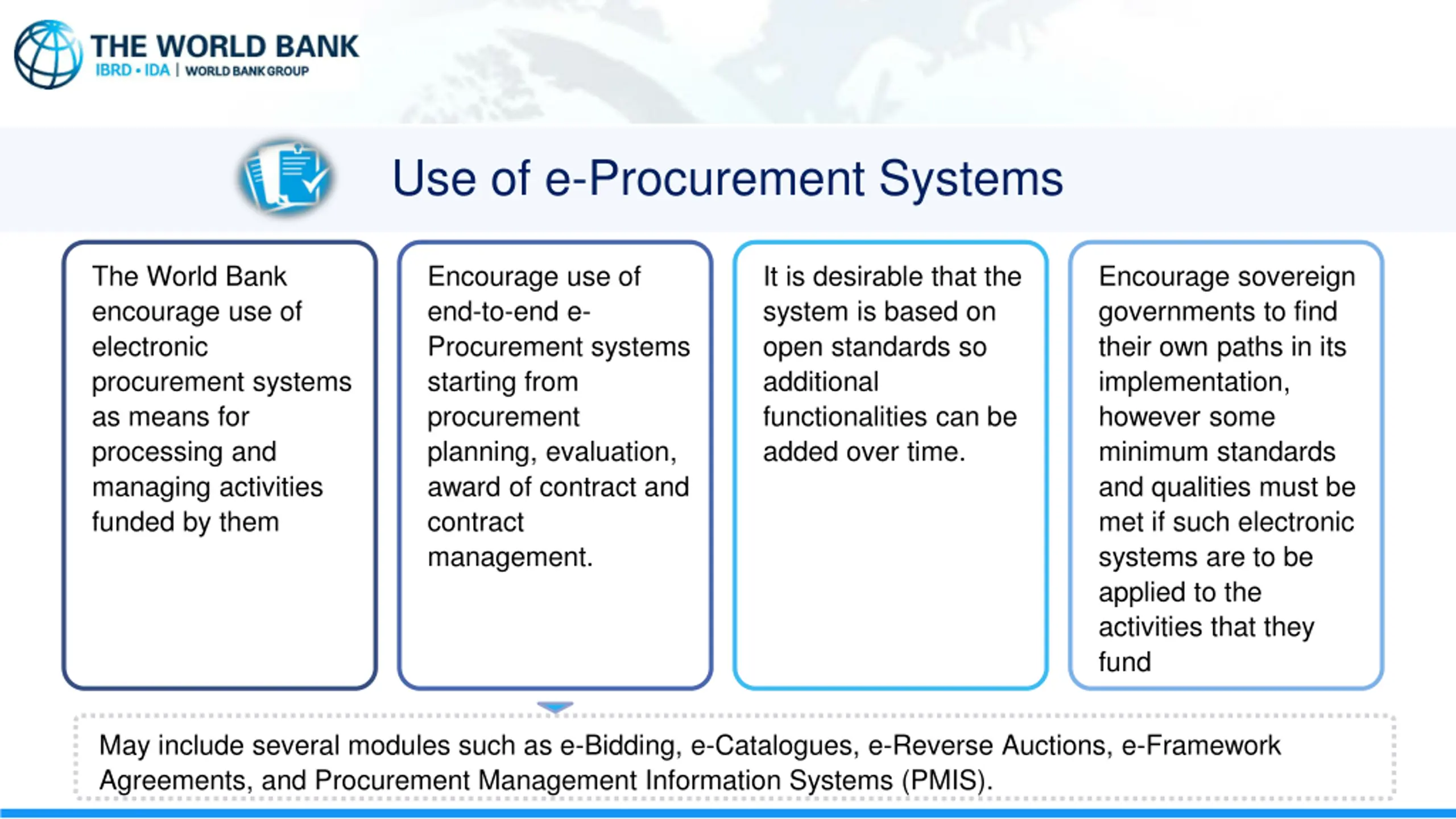 Use of e-Procurement Systems The World Bank encourage use of electronic procurement systems as means for processing and managing activities funded by them Encourage use of end-to-end e- Procurement systems starting from procurement planning, evaluation, award of contract and contract management. It is desirable that the system is based on open standards so additional functionalities can be added over time. Encourage sovereign governments to find their own paths in its implementation, however some minimum standards and qualities must be met if such electronic systems are to be applied to the activities that they fund May include several modules such as e-Bidding, e-Catalogues, e-Reverse Auctions, e-Framework Agreements, and Procurement Management Information Systems (PMIS).