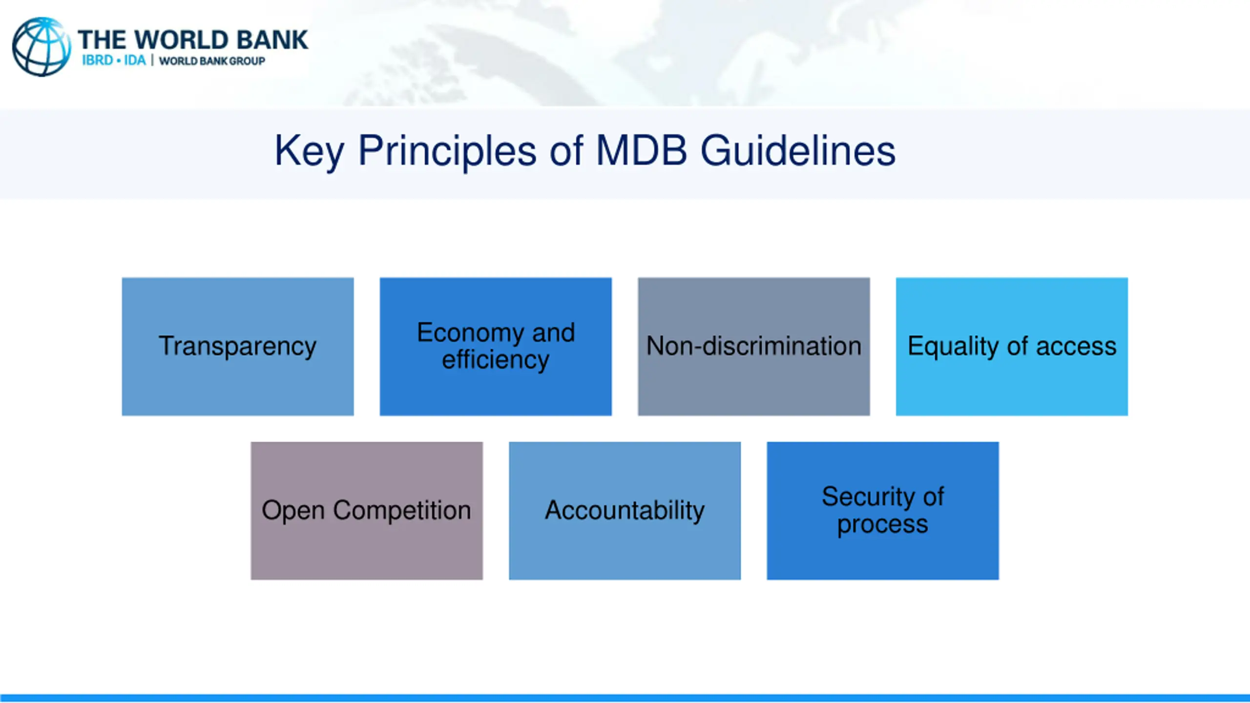 Key Principles of MDB Guidelines Economy and efficiency Transparency Non-discrimination Equality of access Security of process Open Competition Accountability