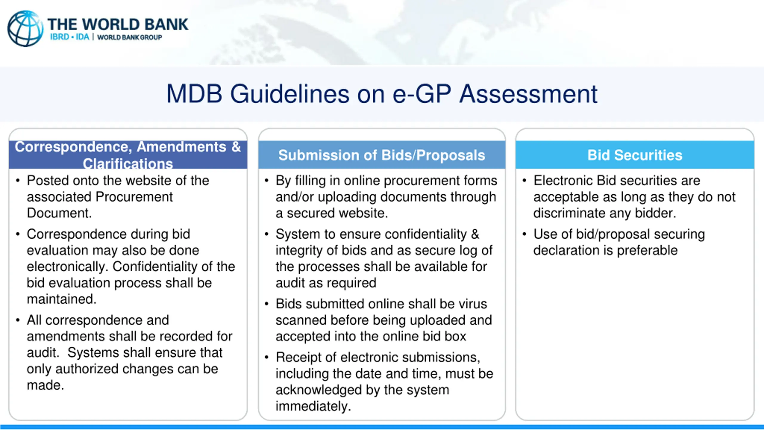 MDB Guidelines on e-GP Assessment Correspondence, Amendments & Clarifications Posted onto the website of the associated Procurement Document. Correspondence during bid evaluation may also be done electronically. Confidentiality of the bid evaluation process shall be maintained. All correspondence and amendments shall be recorded for audit. Systems shall ensure that only authorized changes can be made. Submission of Bids/Proposals Bid Securities By filling in online procurement forms and/or uploading documents through a secured website. System to ensure confidentiality & integrity of bids and as secure log of the processes shall be available for audit as required Bids submitted online shall be virus scanned before being uploaded and accepted into the online bid box Receipt of electronic submissions, including the date and time, must be acknowledged by the system immediately. Electronic Bid securities are acceptable as long as they do not discriminate any bidder. Use of bid/proposal securing declaration is preferable