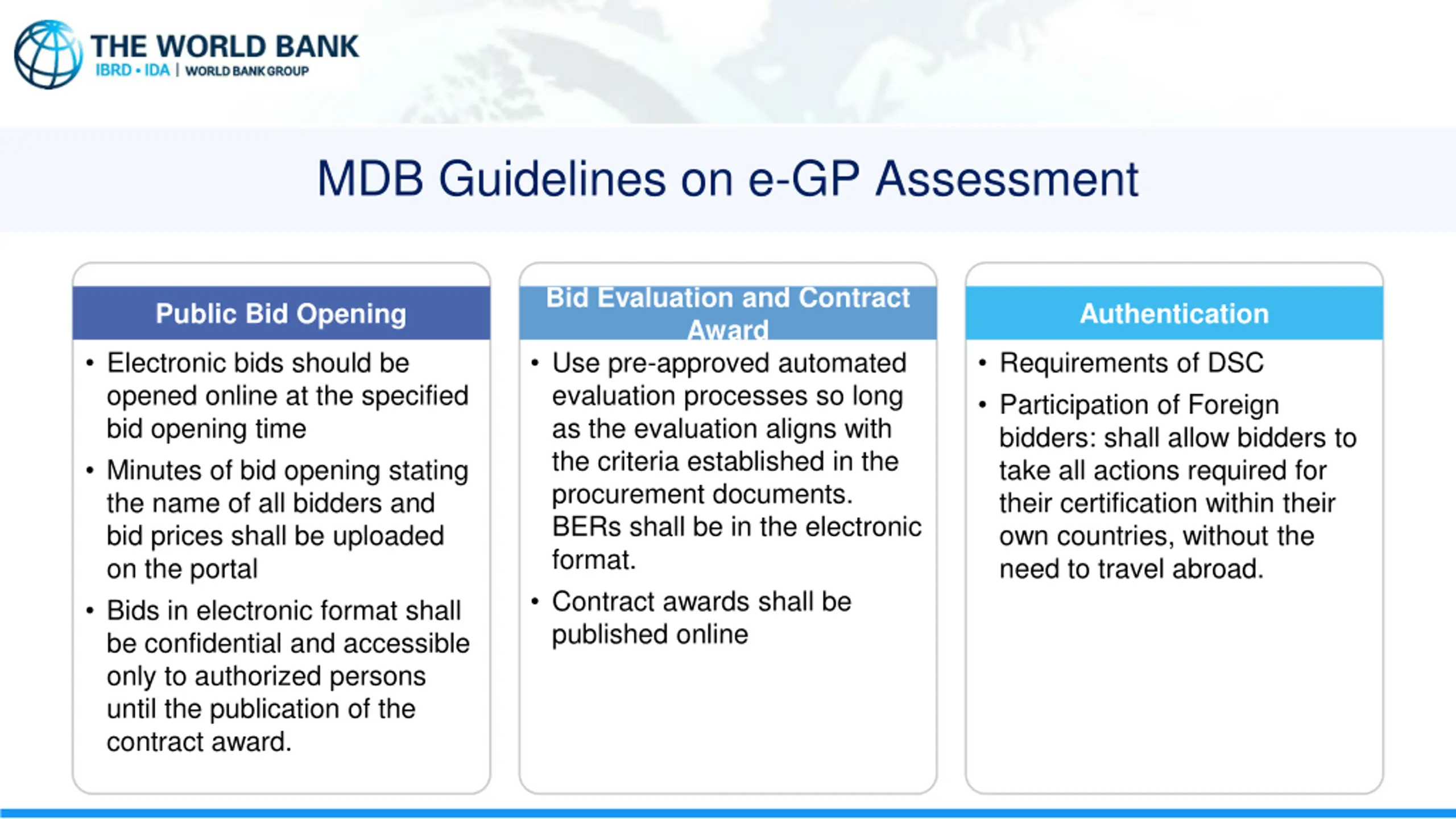 MDB Guidelines on e-GP Assessment Bid Evaluation and Contract Award Use pre-approved automated evaluation processes so long as the evaluation aligns with the criteria established in the procurement documents. BERs shall be in the electronic format. Contract awards shall be published online Authentication Public Bid Opening Electronic bids should be opened online at the specified bid opening time Minutes of bid opening stating the name of all bidders and bid prices shall be uploaded on the portal Bids in electronic format shall be confidential and accessible only to authorized persons until the publication of the contract award. Requirements of DSC Participation of Foreign bidders: shall allow bidders to take all actions required for their certification within their own countries, without the need to travel abroad.