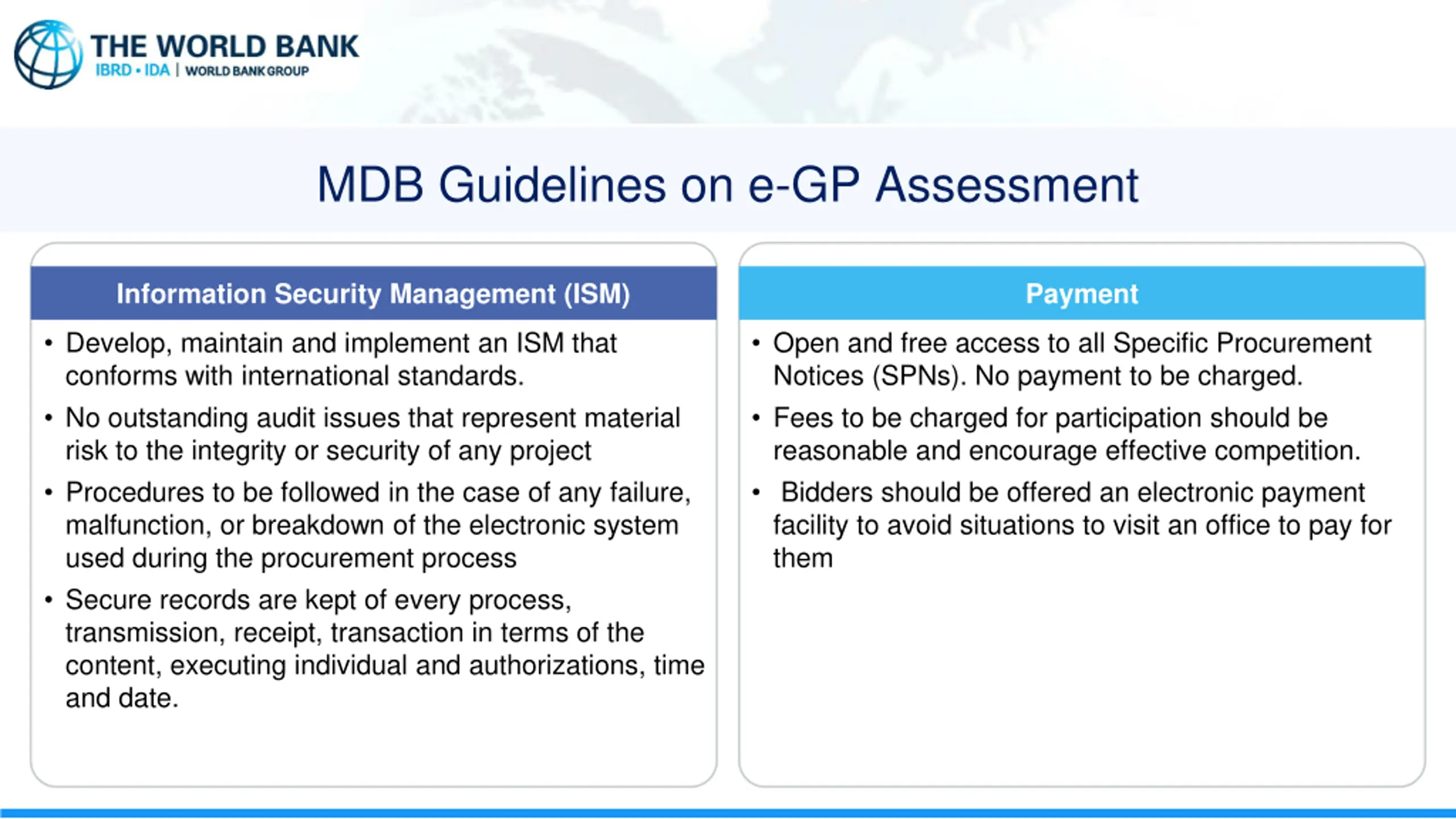 MDB Guidelines on e-GP Assessment Information Security Management (ISM) Payment Develop, maintain and implement an ISM that conforms with international standards. No outstanding audit issues that represent material risk to the integrity or security of any project Procedures to be followed in the case of any failure, malfunction, or breakdown of the electronic system used during the procurement process Secure records are kept of every process, transmission, receipt, transaction in terms of the content, executing individual and authorizations, time and date. Open and free access to all Specific Procurement Notices (SPNs). No payment to be charged. Fees to be charged for participation should be reasonable and encourage effective competition. Bidders should be offered an electronic payment facility to avoid situations to visit an office to pay for them