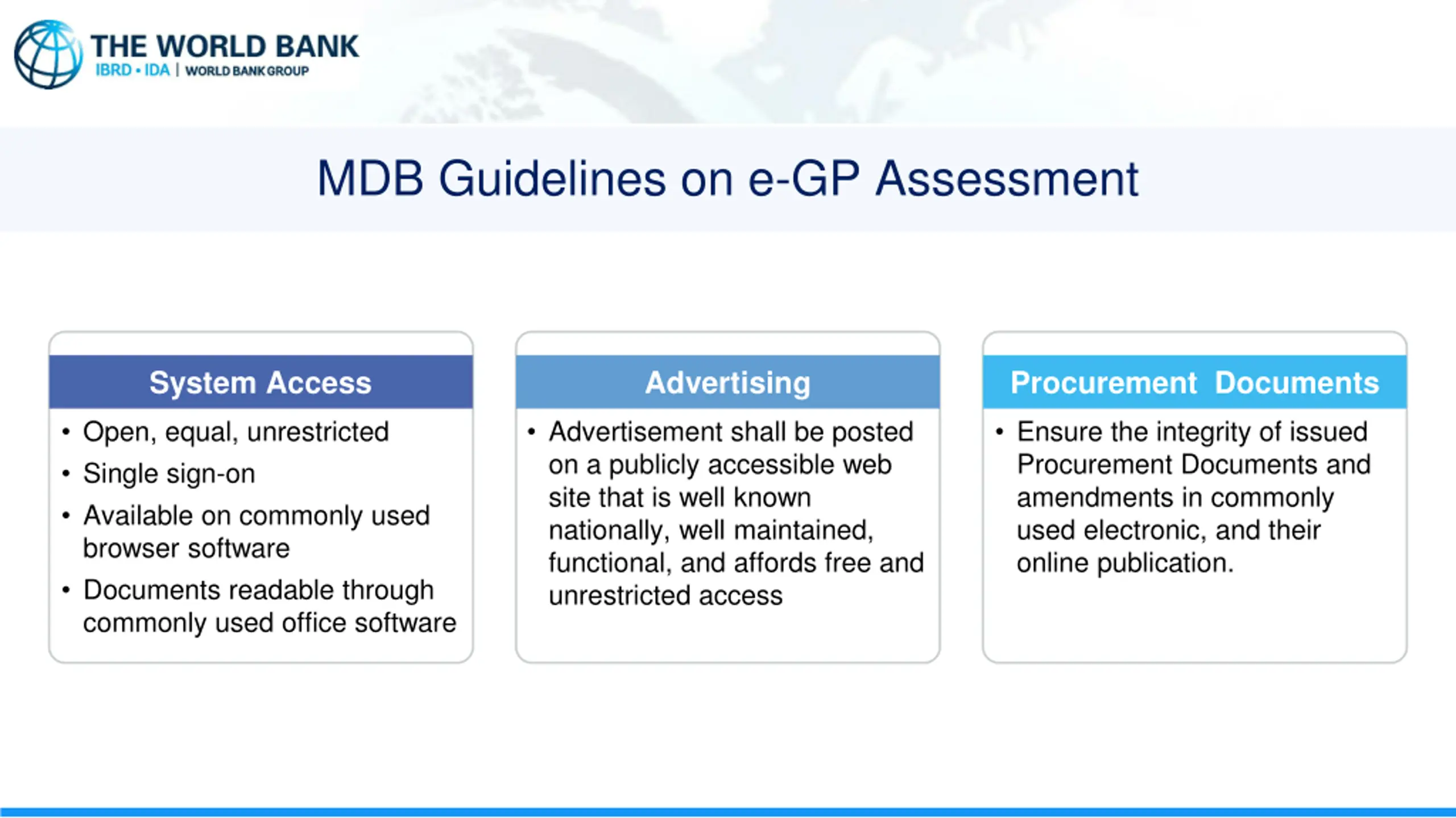 MDB Guidelines on e-GP Assessment System Access Advertising Procurement Documents Open, equal, unrestricted Single sign-on Available on commonly used browser software Documents readable through commonly used office software Advertisement shall be posted on a publicly accessible web site that is well known nationally, well maintained, functional, and affords free and unrestricted access Ensure the integrity of issued Procurement Documents and amendments in commonly used electronic, and their online publication.