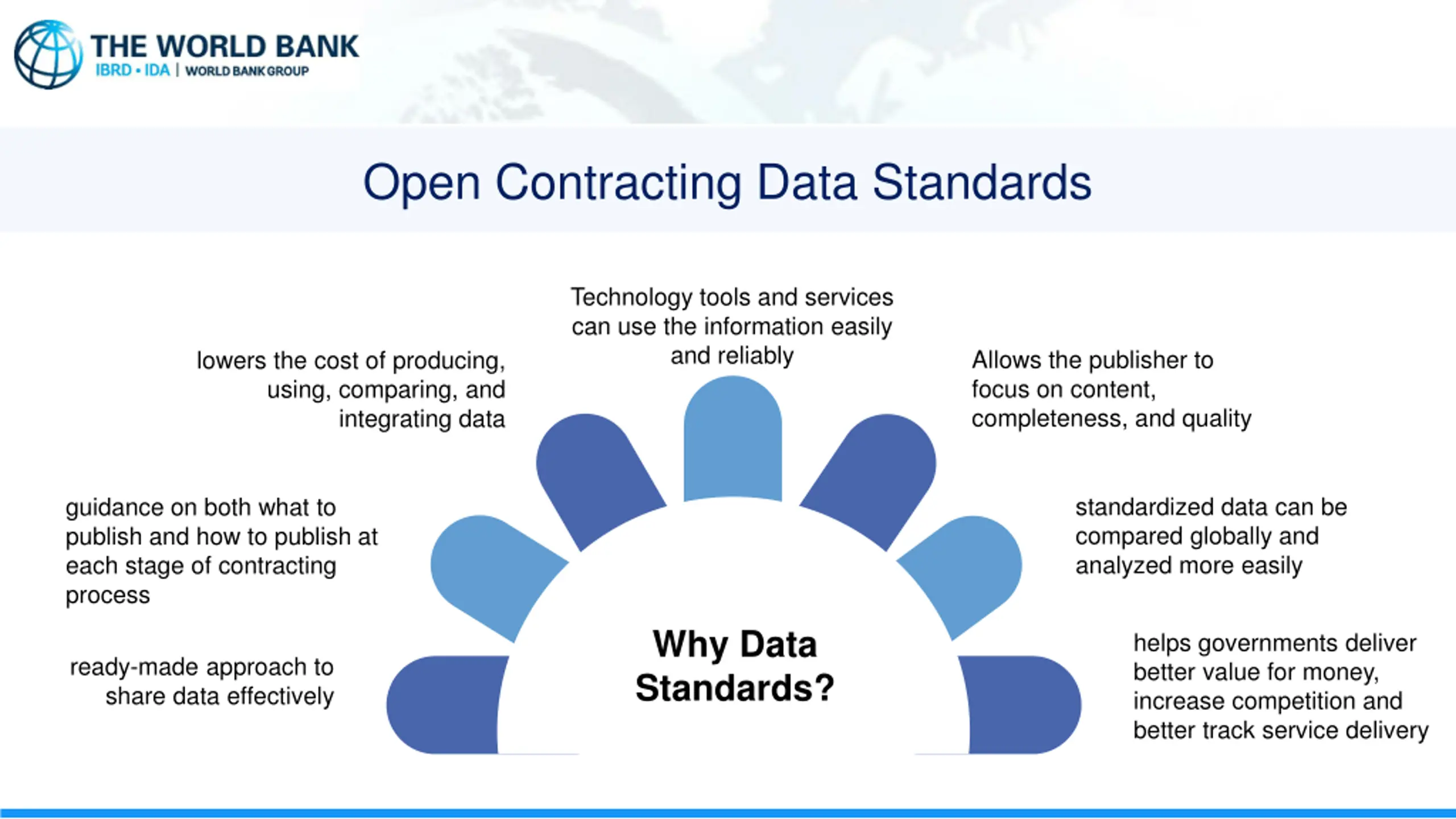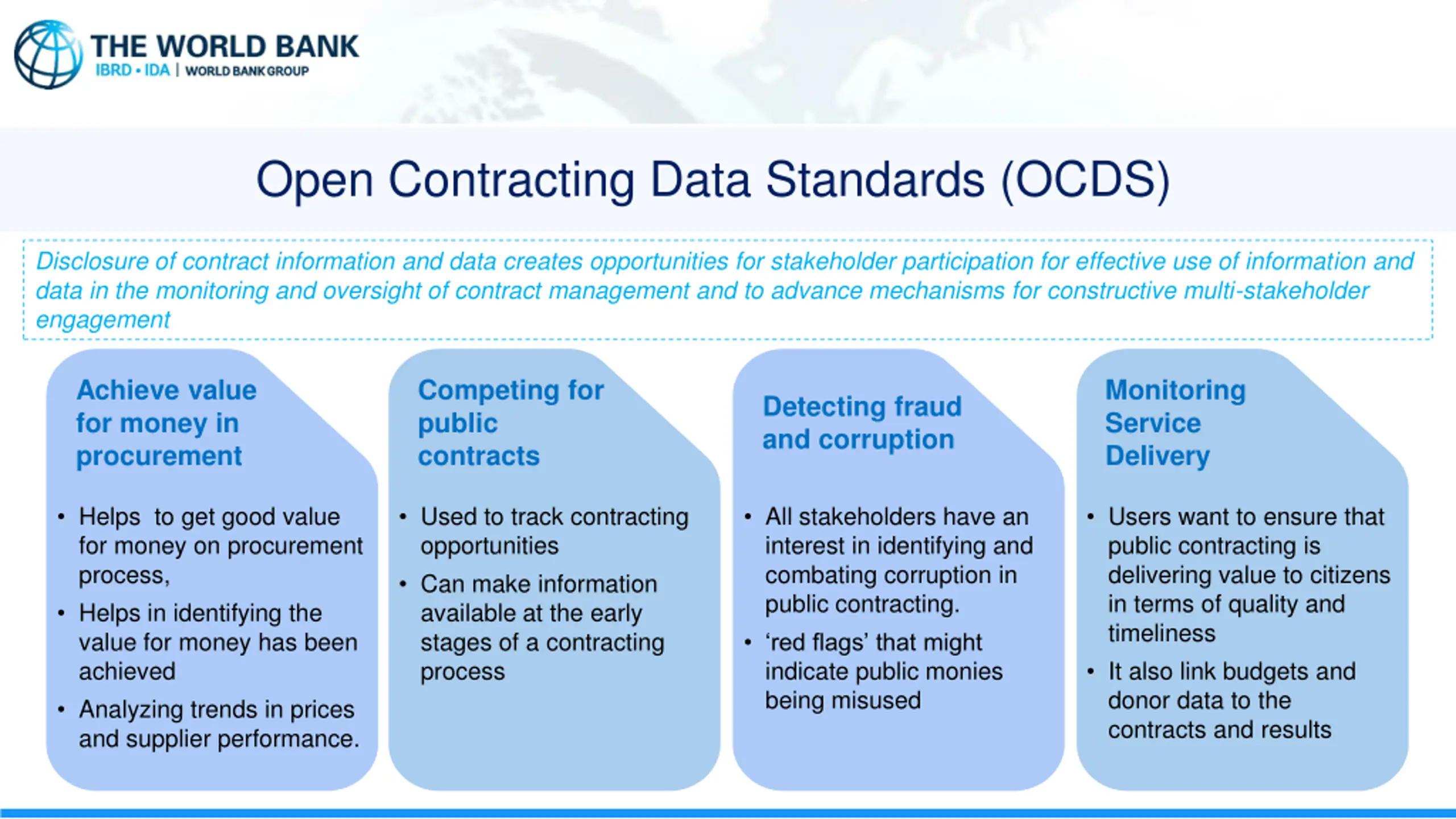 Open Contracting Data Standards (OCDS) Disclosure of contract information and data creates opportunities for stakeholder participation for effective use of information and data in the monitoring and oversight of contract management and to advance mechanisms for constructive multi-stakeholder engagement Achieve value for money in procurement Competing for public contracts Monitoring Service Delivery Detecting fraud and corruption Helps to get good value for money on procurement process, Helps in identifying the value for money has been achieved Analyzing trends in prices and supplier performance. Used to track contracting opportunities Can make information available at the early stages of a contracting process All stakeholders have an interest in identifying and combating corruption in public contracting. red flags that might indicate public monies being misused Users want to ensure that public contracting is delivering value to citizens in terms of quality and timeliness It also link budgets and donor data to the contracts and results