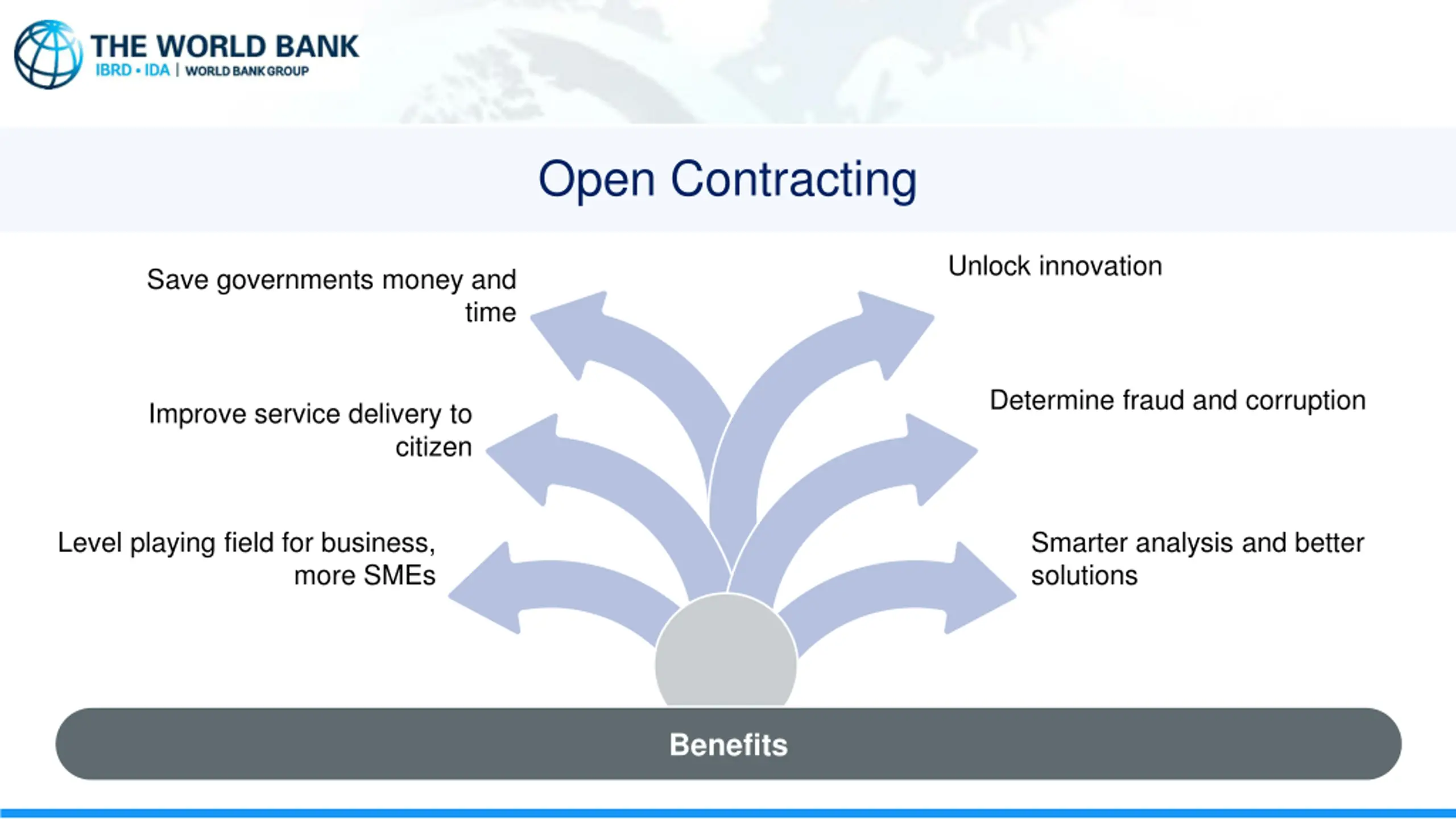 Open Contracting Unlock innovation Save governments money and time Determine fraud and corruption Improve service delivery to citizen Level playing field for business, Smarter analysis and better solutions more SMEs Benefits