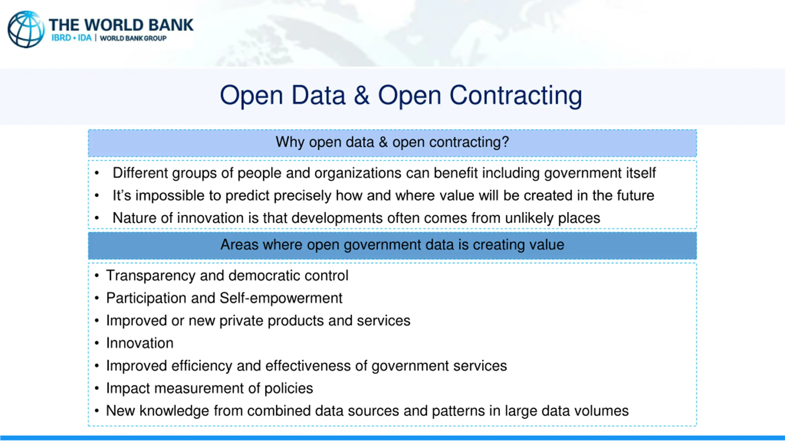 Open Data & Open Contracting Why open data & open contracting? Different groups of people and organizations can benefit including government itself It s impossible to predict precisely how and where value will be created in the future Nature of innovation is that developments often comes from unlikely places Areas where open government data is creating value Transparency and democratic control Participation and Self-empowerment Improved or new private products and services Innovation Improved efficiency and effectiveness of government services Impact measurement of policies New knowledge from combined data sources and patterns in large data volumes