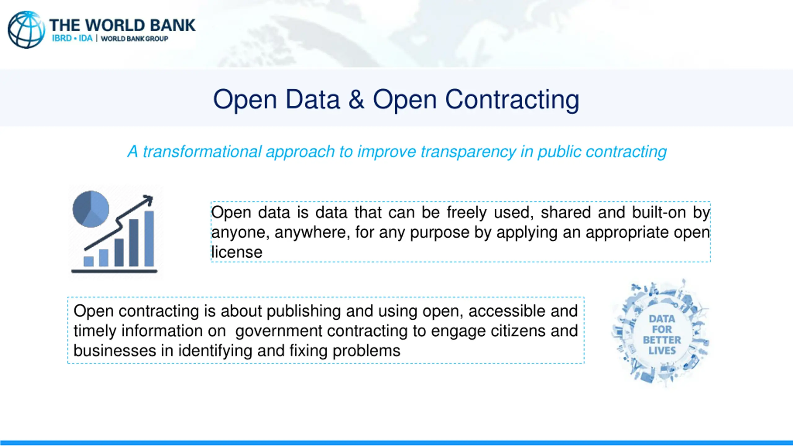 Open Data & Open Contracting A transformational approach to improve transparency in public contracting Open data is data that can be freely used, shared and built-on by anyone, anywhere, for any purpose by applying an appropriate open license Open contracting is about publishing and using open, accessible and timely information on government contracting to engage citizens and businesses in identifying and fixing problems