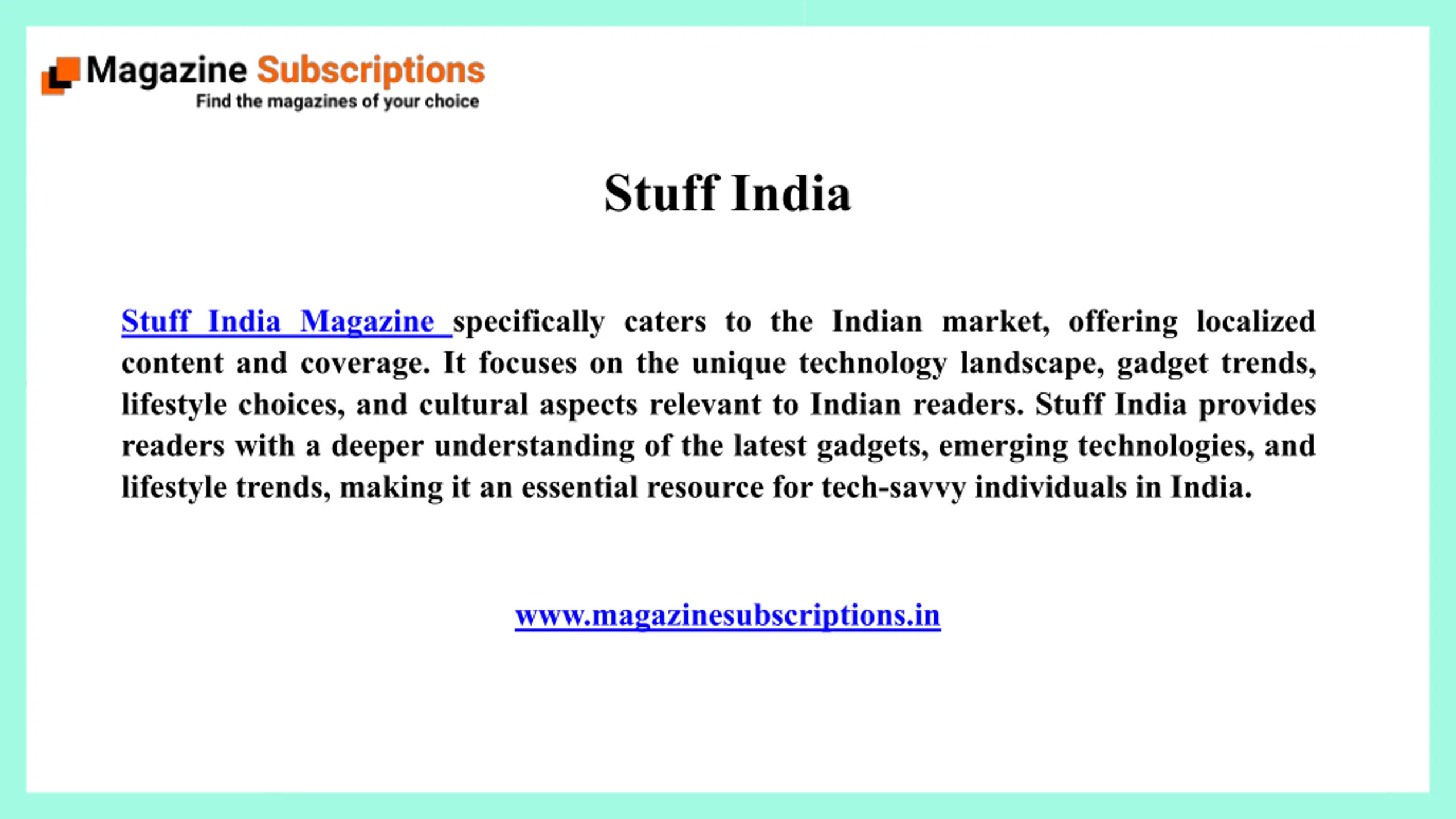 Stuff India Stuff India Magazine specifically caters to the Indian market, offering localized content and coverage. It focuses on the unique technology landscape, gadget trends, lifestyle choices, and cultural aspects relevant to Indian readers. Stuff India provides readers with a deeper understanding of the latest gadgets, emerging technologies, and lifestyle trends, making it an essential resource for tech-savvy individuals in India. www.magazinesubscriptions.in
