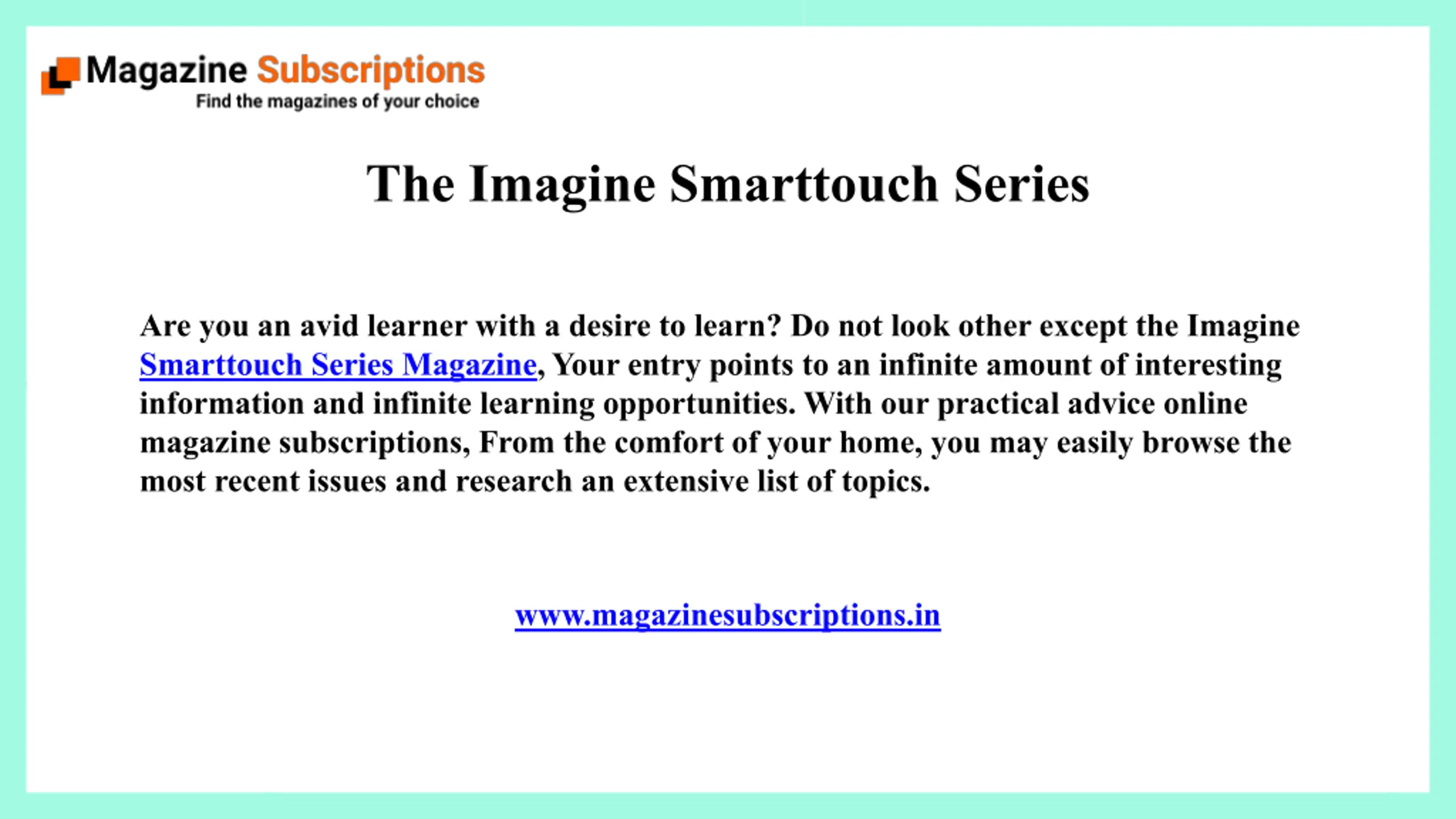 The Imagine Smarttouch Series Are you an avid learner with a desire to learn? Do not look other except the Imagine Smarttouch Series Magazine, Your entry points to an infinite amount of interesting information and infinite learning opportunities. With our practical advice online magazine subscriptions, From the comfort of your home, you may easily browse the most recent issues and research an extensive list of topics. www.magazinesubscriptions.in