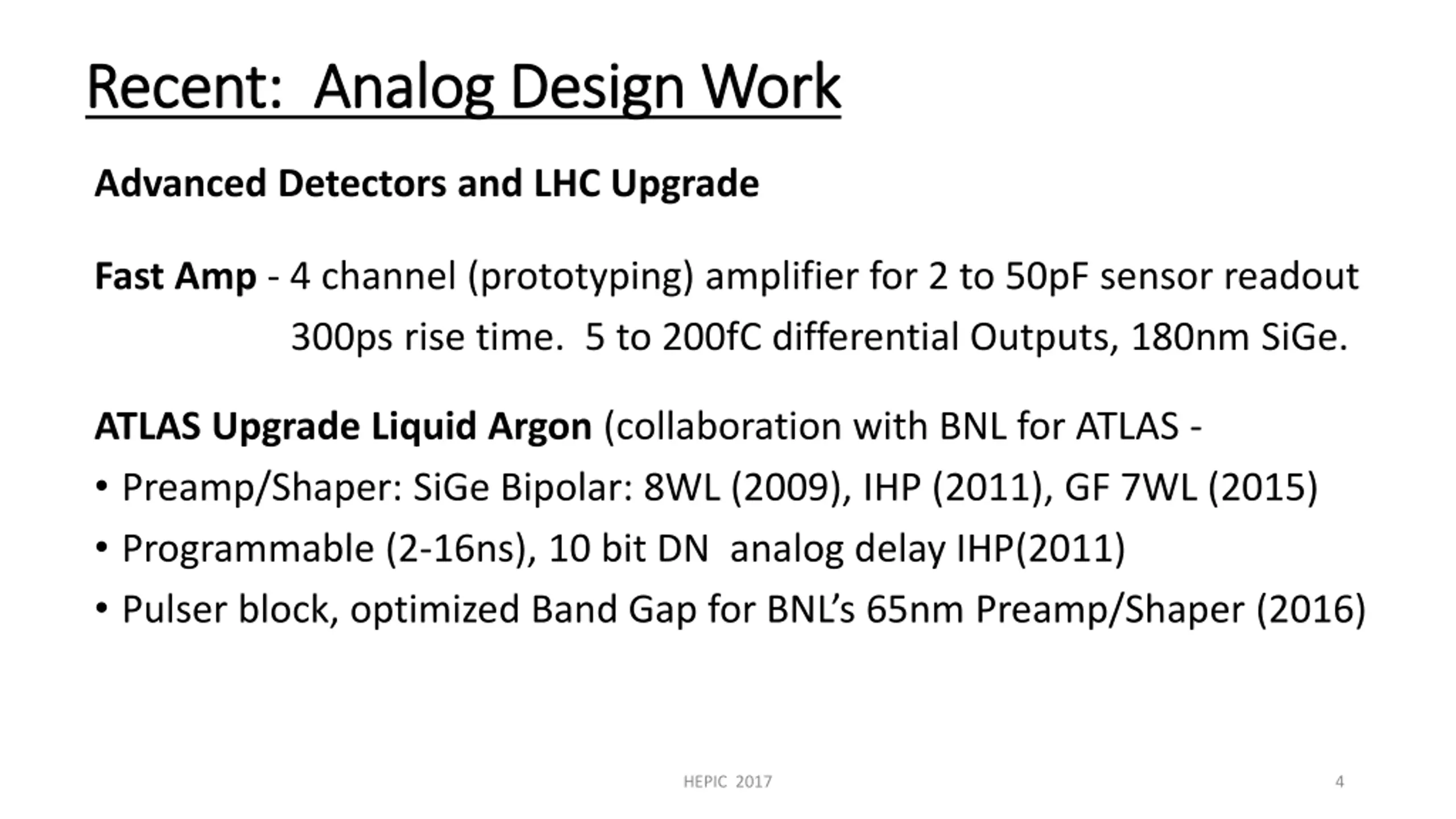 Recent: Analog Design Work Recent: Analog Design Work Advanced Detectors and LHC Upgrade Fast Amp - 4 channel (prototyping) amplifier for 2 to 50pF sensor readout 300ps rise time. 5 to 200fC differential Outputs, 180nm SiGe. ATLAS Upgrade Liquid Argon (collaboration with BNL for ATLAS - Preamp/Shaper: SiGe Bipolar: 8WL (2009), IHP (2011), GF 7WL (2015) Programmable (2-16ns), 10 bit DN analog delay IHP(2011) Pulser block, optimized Band Gap for BNL s 65nm Preamp/Shaper (2016) HEPIC 2017 4