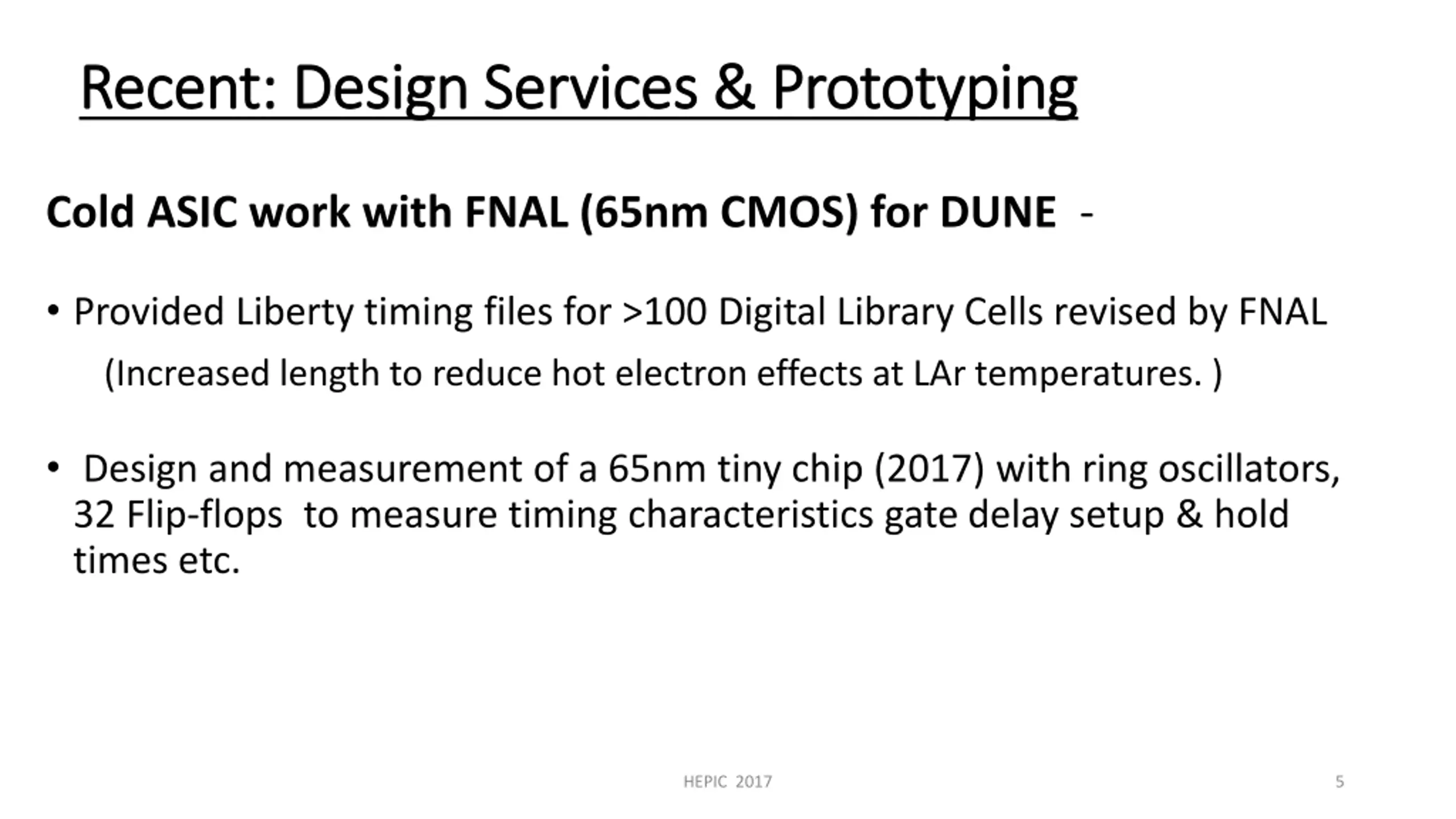 Recent: Design Services & Prototyping Recent: Design Services & Prototyping Cold ASIC work with FNAL (65nm CMOS) for DUNE - Provided Liberty timing files for >100 Digital Library Cells revised by FNAL (Increased length to reduce hot electron effects at LAr temperatures. ) Design and measurement of a 65nm tiny chip (2017) with ring oscillators, 32 Flip-flops to measure timing characteristics gate delay setup & hold times etc. HEPIC 2017 5