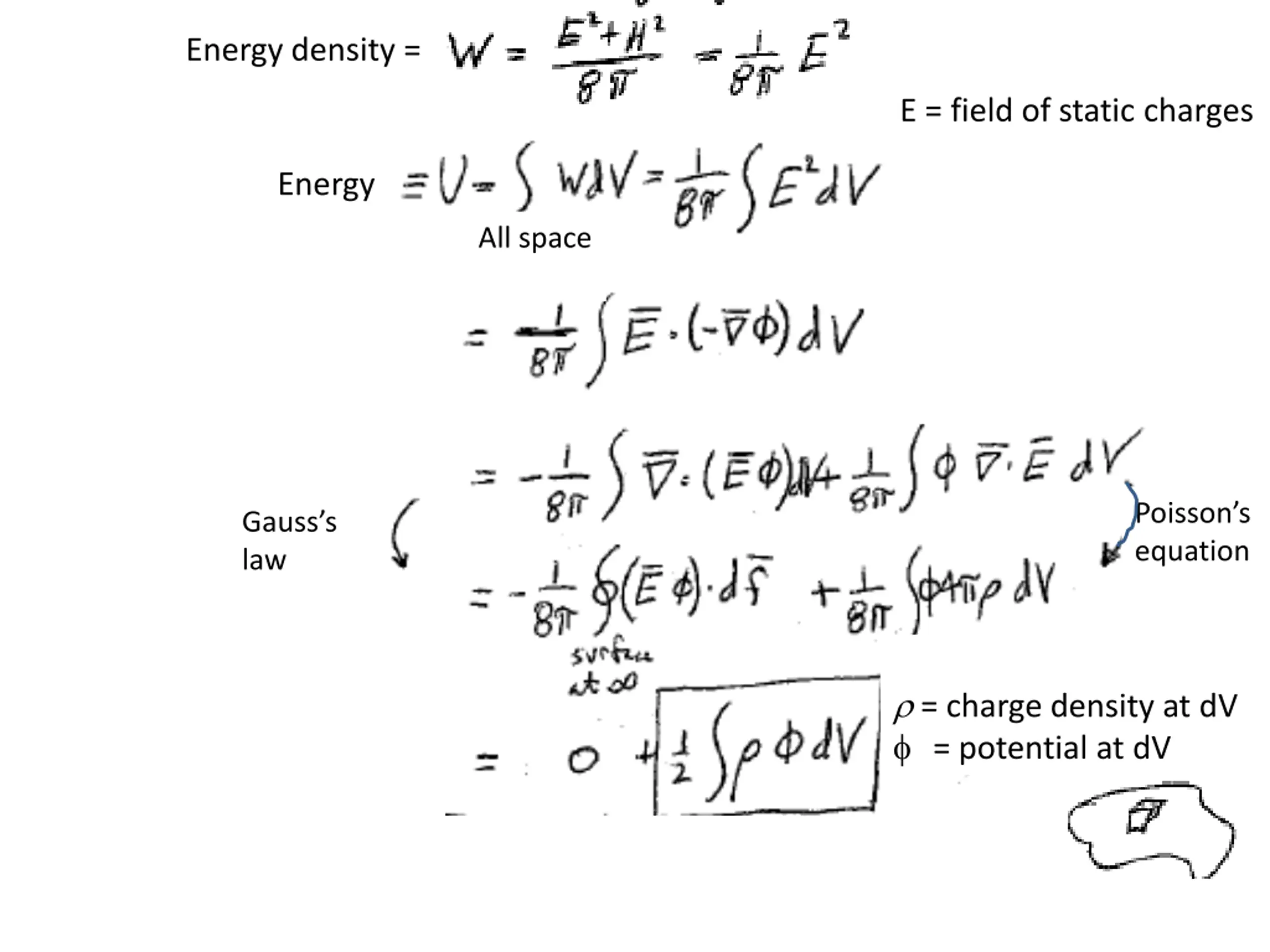 Energy density = E = field of static charges Energy All space Poisson s equation Gauss s law = charge density at dV = potential at dV