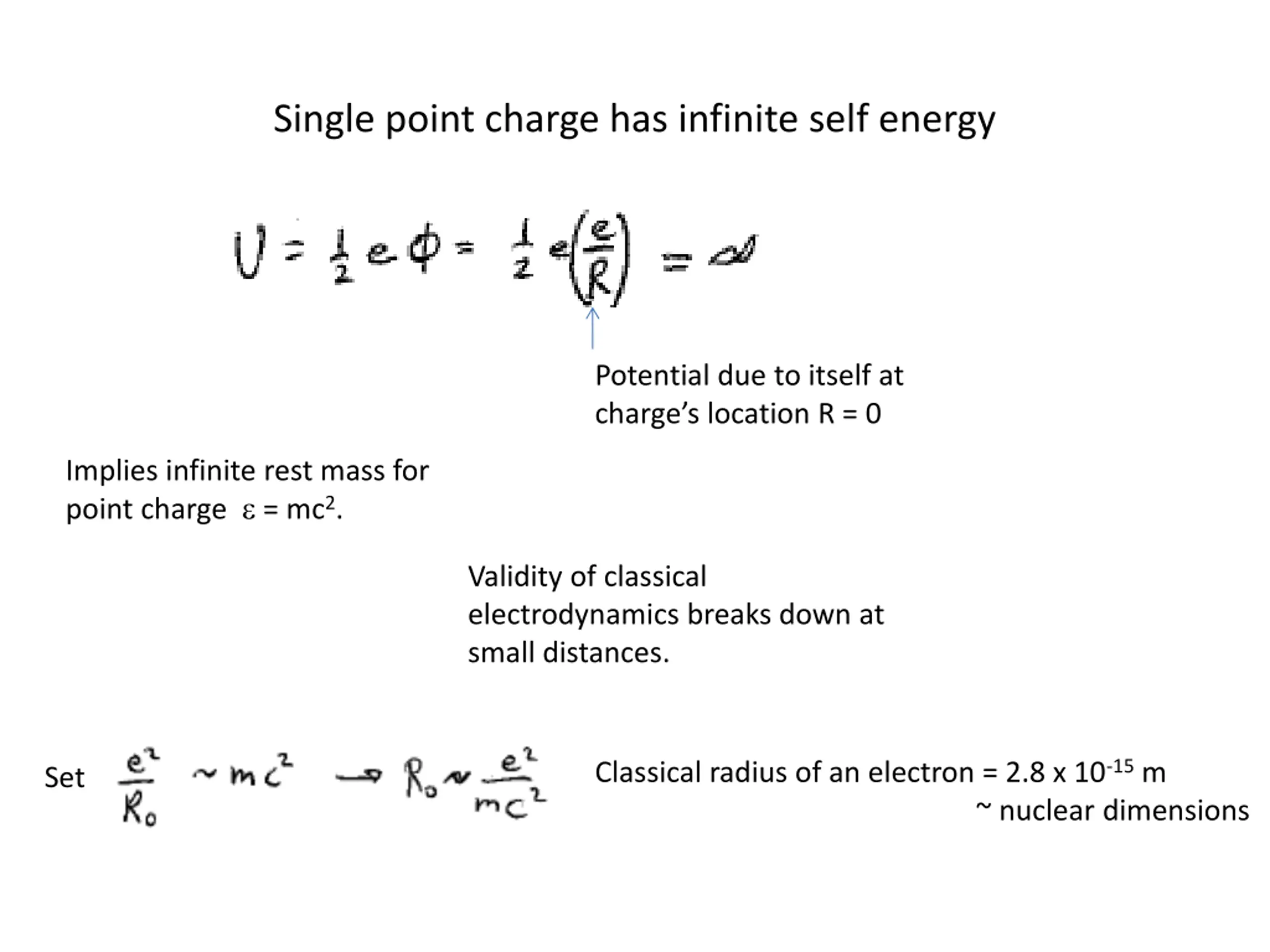 Single point charge has infinite self energy Potential due to itself at charge s location R = 0 Implies infinite rest mass for point charge = mc2. Validity of classical electrodynamics breaks down at small distances. Classical radius of an electron = 2.8 x 10-15 m Set ~ nuclear dimensions