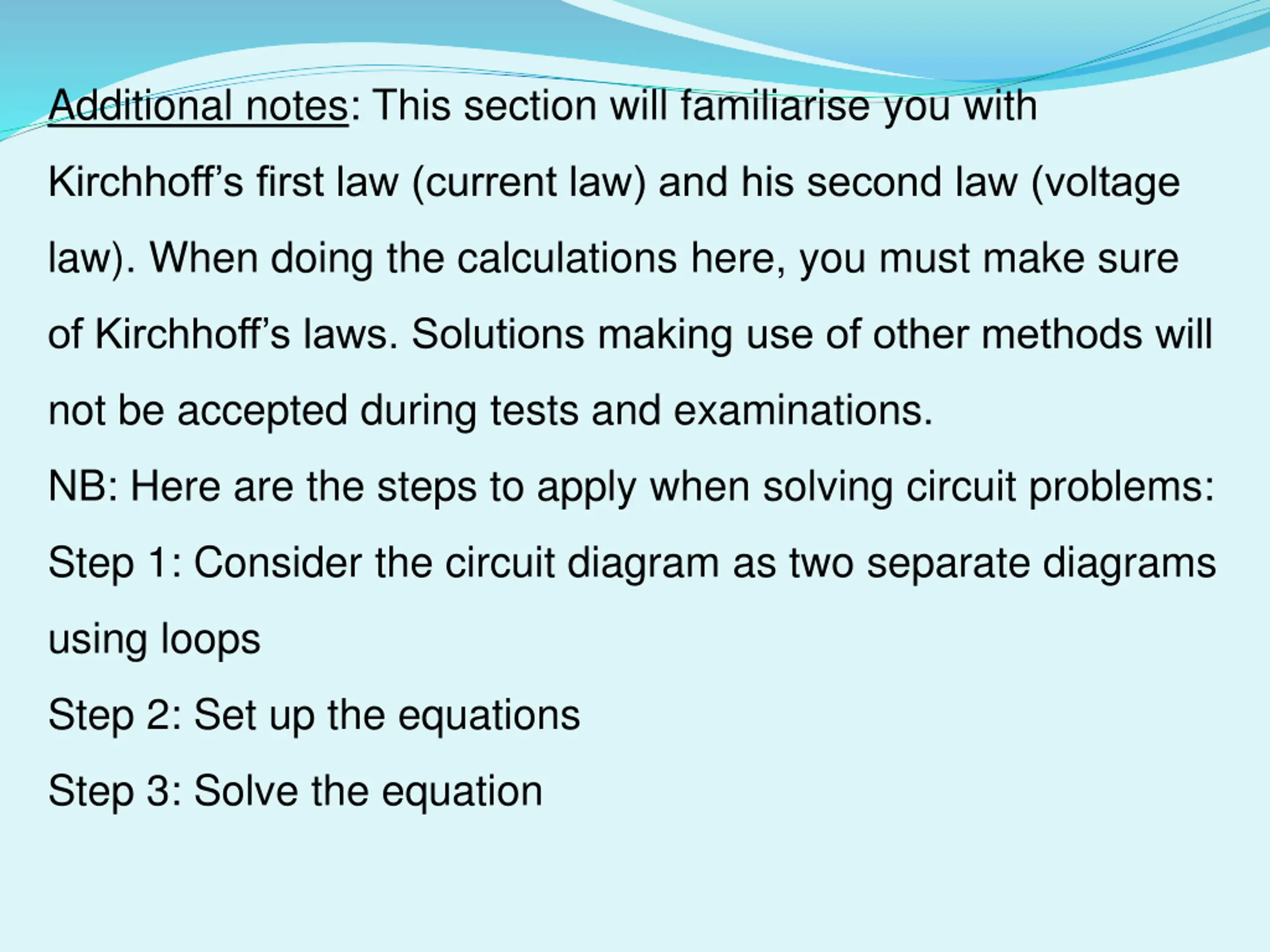 Additional notes: This section will familiarise you with Kirchhoff s first law (current law) and his second law (voltage law). When doing the calculations here, you must make sure of Kirchhoff s laws. Solutions making use of other methods will not be accepted during tests and examinations. NB: Here are the steps to apply when solving circuit problems: Step 1: Consider the circuit diagram as two separate diagrams using loops Step 2: Set up the equations Step 3: Solve the equation