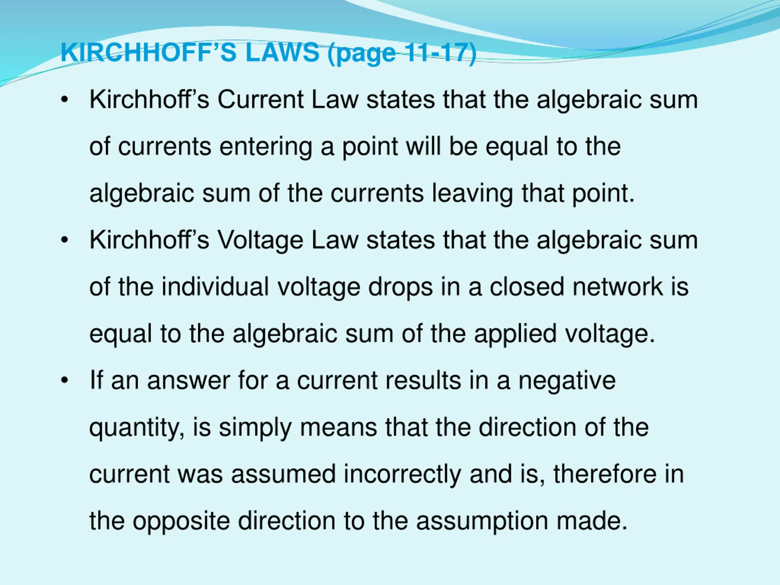 KIRCHHOFFS LAWS (page 11-17) Kirchhoff s Current Law states that the algebraic sum of currents entering a point will be equal to the algebraic sum of the currents leaving that point. Kirchhoff s Voltage Law states that the algebraic sum of the individual voltage drops in a closed network is equal to the algebraic sum of the applied voltage. If an answer for a current results in a negative quantity, is simply means that the direction of the current was assumed incorrectly and is, therefore in the opposite direction to the assumption made.