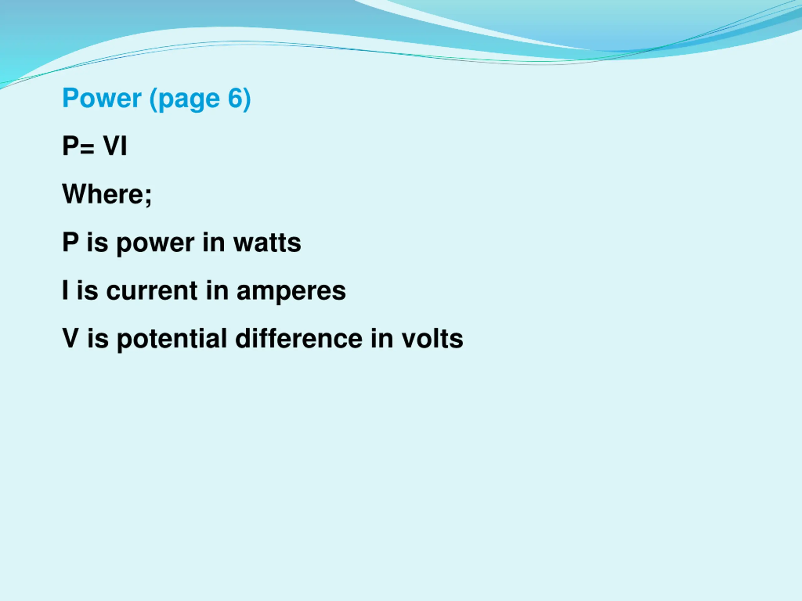 Power (page 6) P= VI Where; P is power in watts I is current in amperes V is potential difference in volts