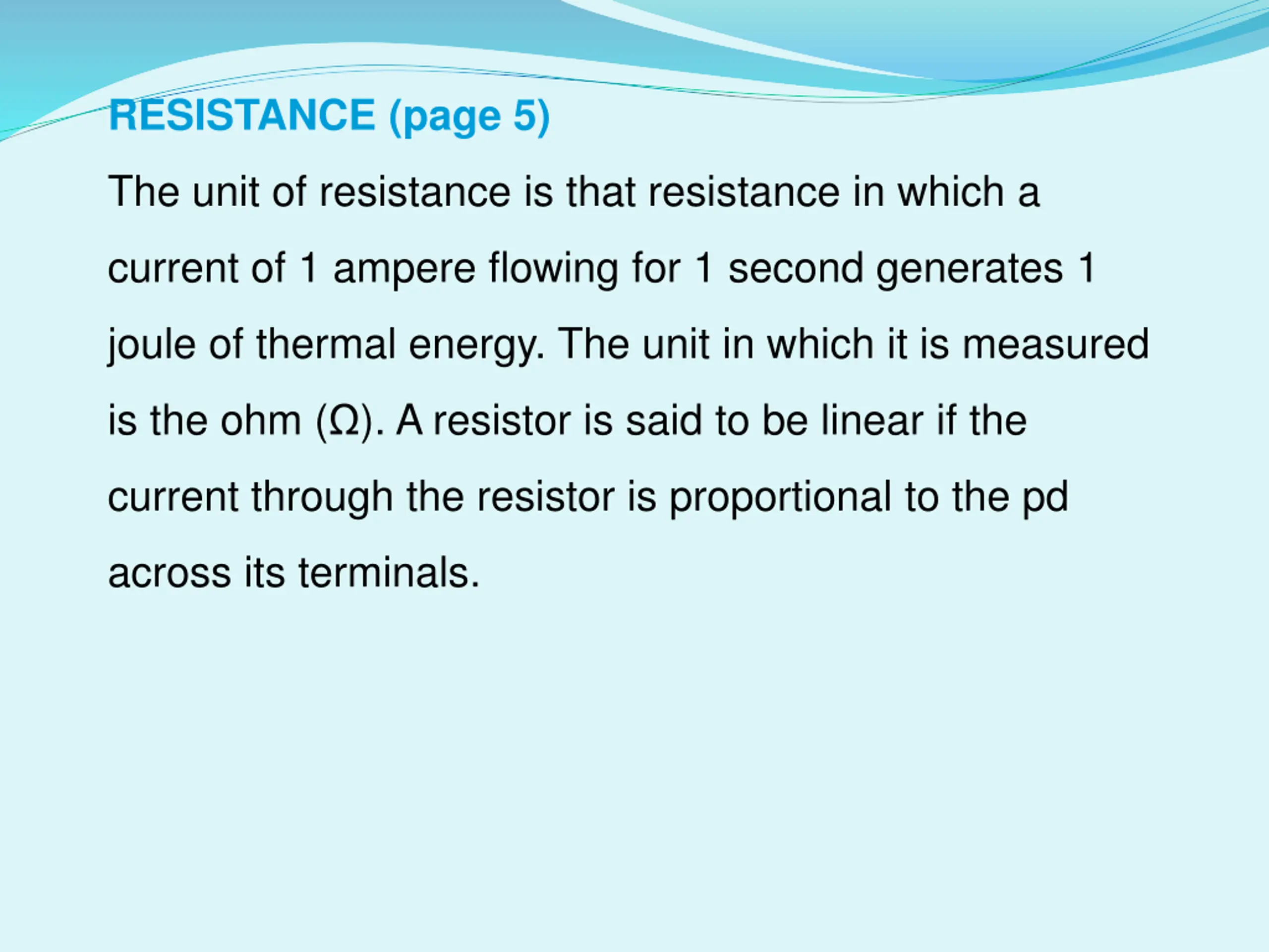 RESISTANCE (page 5) The unit of resistance is that resistance in which a current of 1 ampere flowing for 1 second generates 1 joule of thermal energy. The unit in which it is measured is the ohm ( ). A resistor is said to be linear if the current through the resistor is proportional to the pd across its terminals.