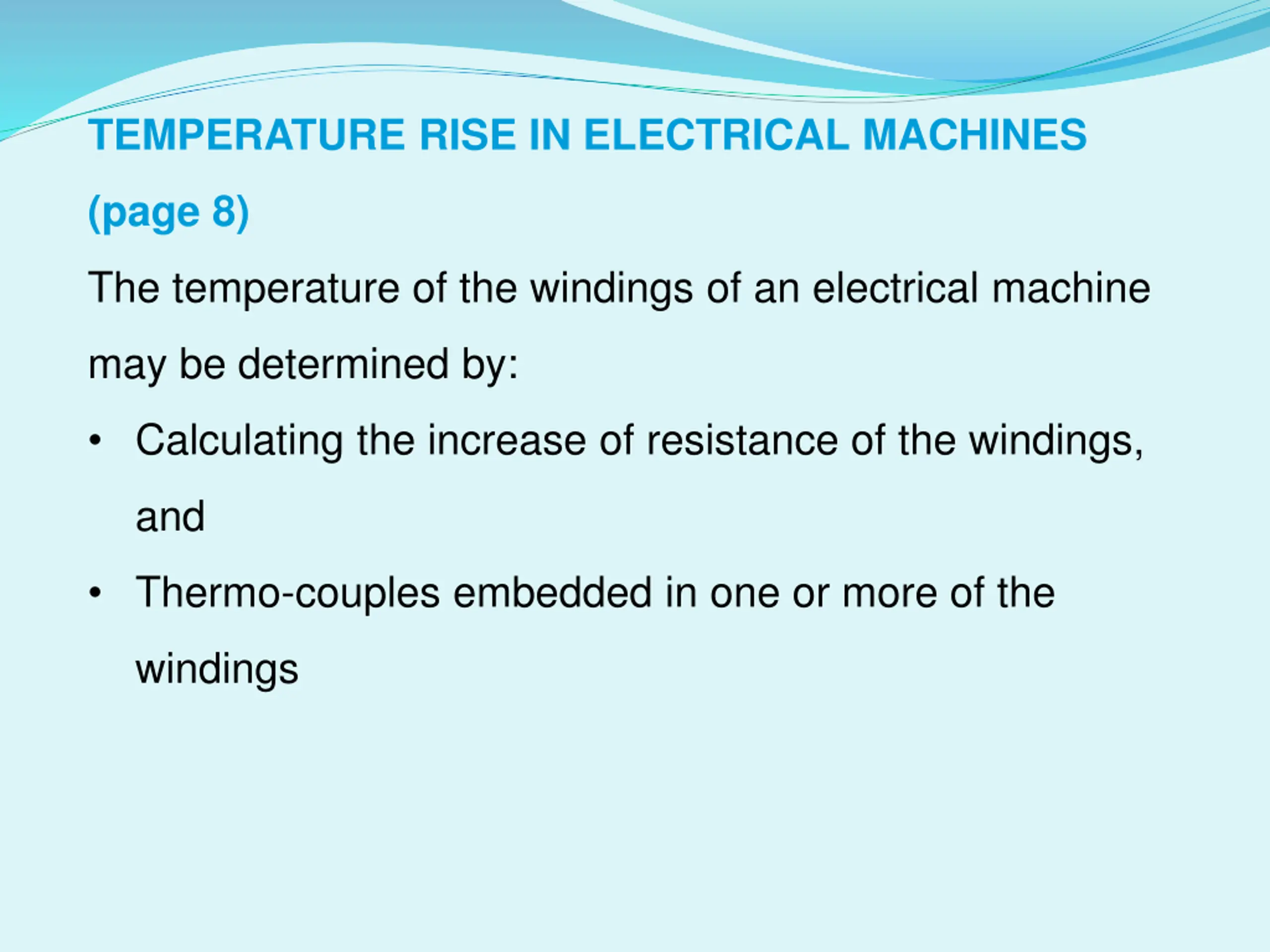 TEMPERATURE RISE IN ELECTRICAL MACHINES (page 8) The temperature of the windings of an electrical machine may be determined by: Calculating the increase of resistance of the windings, and Thermo-couples embedded in one or more of the windings
