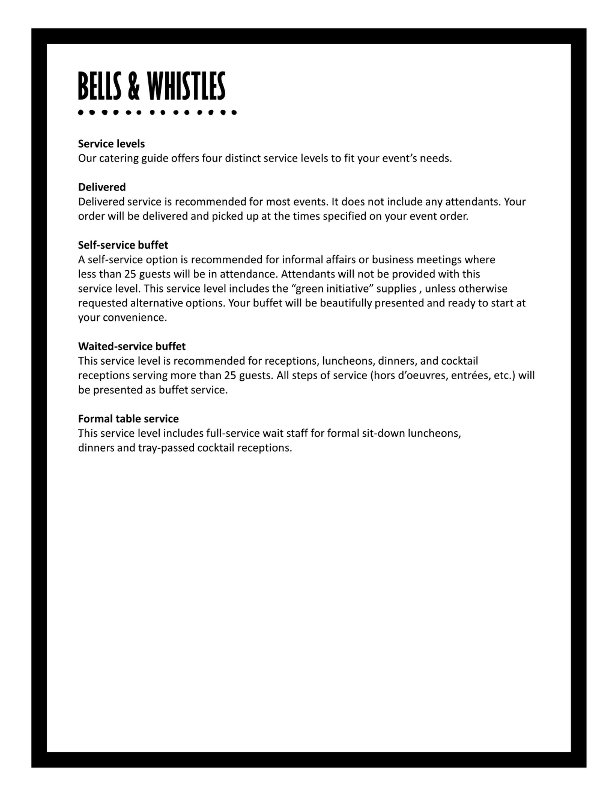BELLS & WHISTLES Service levels Our catering guide offers four distinct service levels to fit your event s needs. Delivered Delivered service is recommended for most events. It does not include any attendants. Your order will be delivered and picked up at the times specified on your event order. Self-service buffet A self-service option is recommended for informal affairs or business meetings where less than 25 guests will be in attendance. Attendants will not be provided with this service level. This service level includes the green initiative supplies , unless otherwise requested alternative options. Your buffet will be beautifully presented and ready to start at your convenience. Waited-service buffet This service level is recommended for receptions, luncheons, dinners, and cocktail receptions serving more than 25 guests. All steps of service (hors d oeuvres, entr es, etc.) will be presented as buffet service. Formal table service . This service level includes full-service wait staff for formal sit-down luncheons, dinners and tray-passed cocktail receptions.