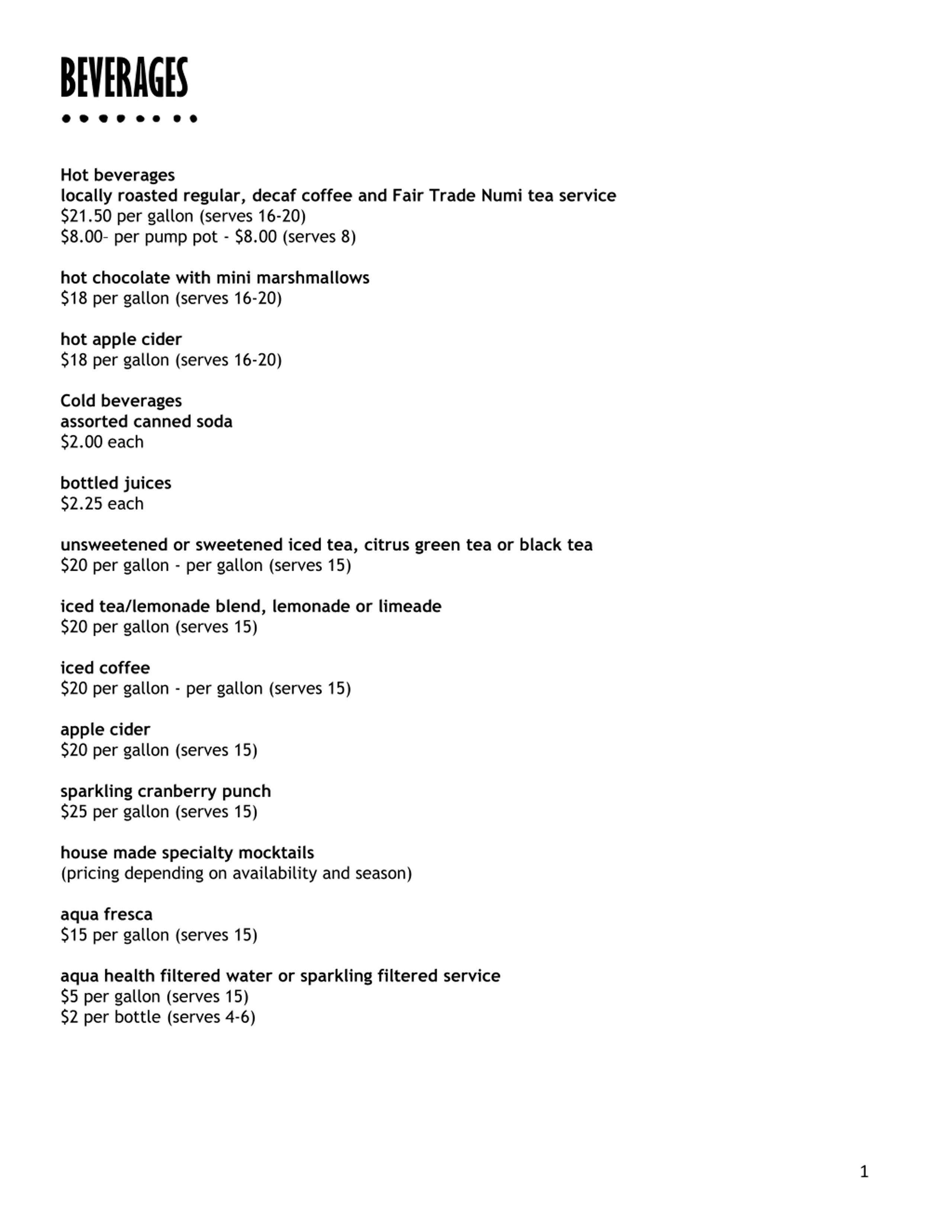 BEVERAGES Hot beverages locally roasted regular, decaf coffee and Fair Trade Numi tea service $21.50 per gallon (serves 16-20) $8.00 per pump pot - $8.00 (serves 8) hot chocolate with mini marshmallows $18 per gallon (serves 16-20) hot apple cider $18 per gallon (serves 16-20) Cold beverages assorted canned soda $2.00 each bottled juices $2.25 each unsweetened or sweetened iced tea, citrus green tea or black tea $20 per gallon - per gallon (serves 15) iced tea/lemonade blend, lemonade or limeade $20 per gallon (serves 15) iced coffee $20 per gallon - per gallon (serves 15) apple cider $20 per gallon (serves 15) sparkling cranberry punch $25 per gallon (serves 15) house made specialty mocktails (pricing depending on availability and season) aqua fresca $15 per gallon (serves 15) aqua health filtered water or sparkling filtered service $5 per gallon (serves 15) $2 per bottle (serves 4-6) 1