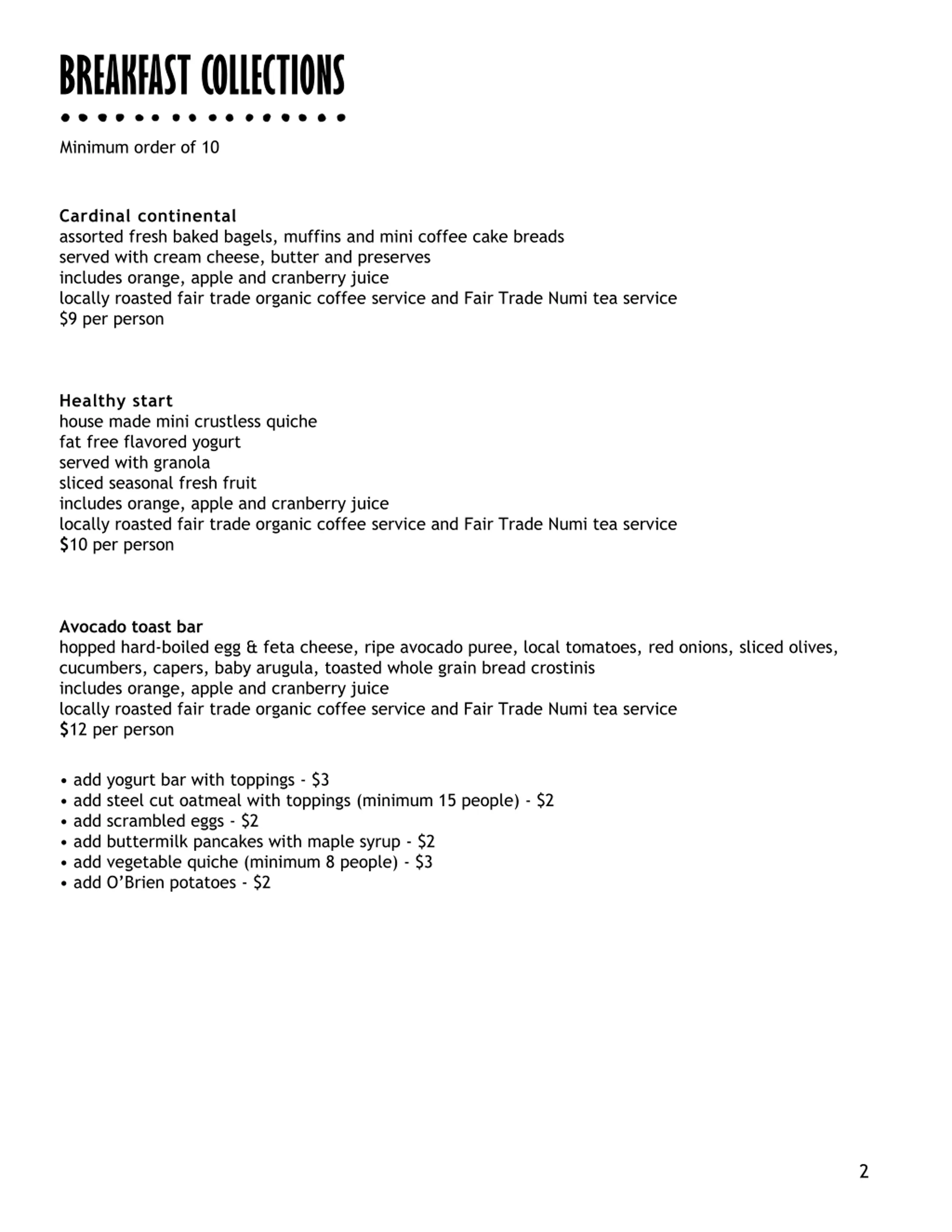 BREAKFAST COLLECTIONS Minimum order of 10 Cardinal continental assorted fresh baked bagels, muffins and mini coffee cake breads served with cream cheese, butter and preserves includes orange, apple and cranberry juice locally roasted fair trade organic coffee service and Fair Trade Numi tea service $9 per person Healthy start house made mini crustless quiche fat free flavored yogurt served with granola sliced seasonal fresh fruit includes orange, apple and cranberry juice locally roasted fair trade organic coffee service and Fair Trade Numi tea service $10 per person Avocado toast bar hopped hard-boiled egg & feta cheese, ripe avocado puree, local tomatoes, red onions, sliced olives, cucumbers, capers, baby arugula, toasted whole grain bread crostinis includes orange, apple and cranberry juice locally roasted fair trade organic coffee service and Fair Trade Numi tea service $12 per person add yogurt bar with toppings - $3 add steel cut oatmeal with toppings (minimum 15 people) - $2 add scrambled eggs - $2 add buttermilk pancakes with maple syrup - $2 add vegetable quiche (minimum 8 people) - $3 add O Brien potatoes - $2 2