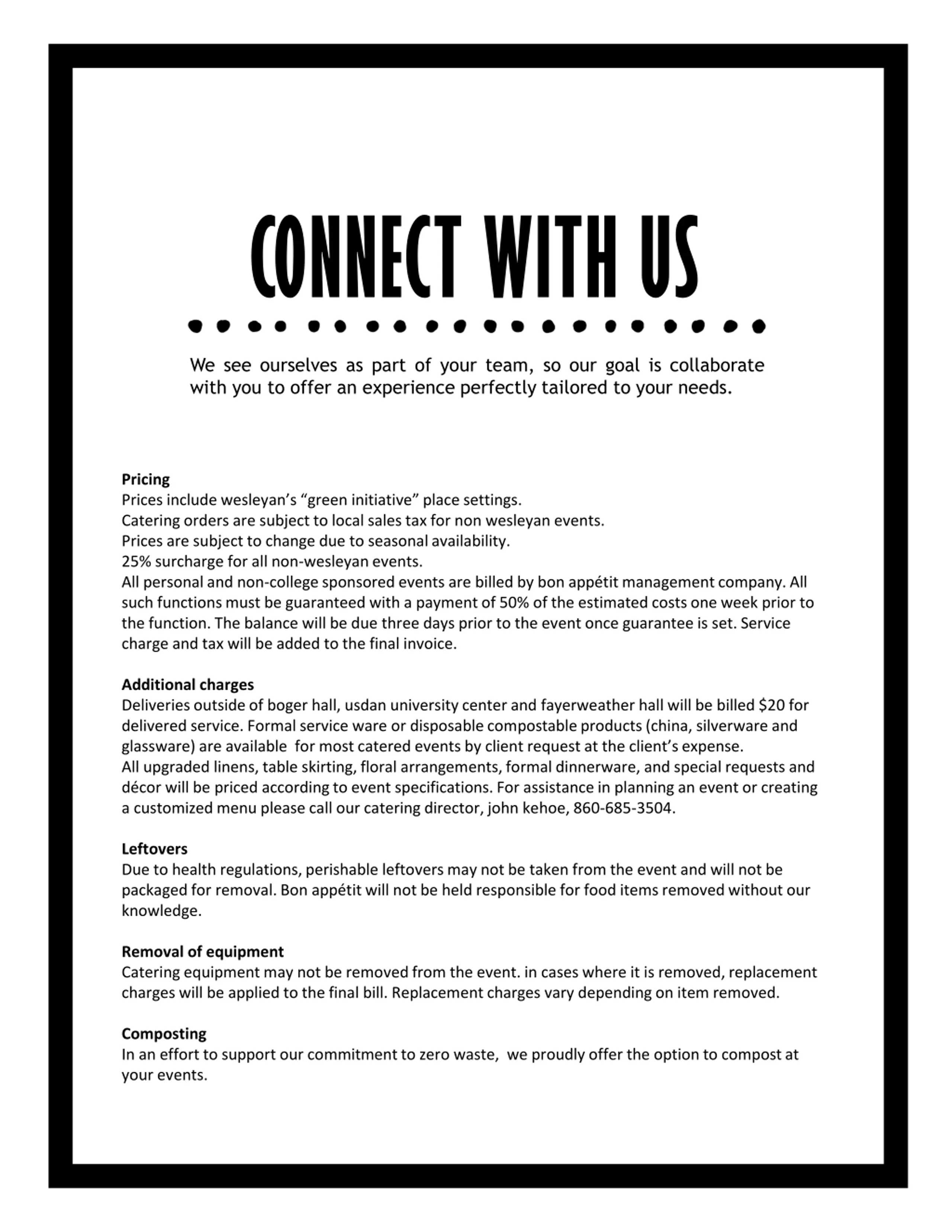 CONNECT WITH US We see ourselves as part of your team, so our goal is collaborate with you to offer an experience perfectly tailored to your needs. Pricing Prices include wesleyan s green initiative place settings. Catering orders are subject to local sales tax for non wesleyan events. Prices are subject to change due to seasonal availability. 25% surcharge for all non-wesleyan events. All personal and non-college sponsored events are billed by bon app tit management company. All such functions must be guaranteed with a payment of 50% of the estimated costs one week prior to the function. The balance will be due three days prior to the event once guarantee is set. Service charge and tax will be added to the final invoice. Additional charges Deliveries outside of boger hall, usdan university center and fayerweather hall will be billed $20 for delivered service. Formal service ware or disposable compostable products (china, silverware and glassware) are available for most catered events by client request at the client s expense. All upgraded linens, table skirting, floral arrangements, formal dinnerware, and special requests and d cor will be priced according to event specifications. For assistance in planning an event or creating a customized menu please call our catering director, john kehoe, 860-685-3504. Leftovers Due to health regulations, perishable leftovers may not be taken from the event and will not be packaged for removal. Bon app tit will not be held responsible for food items removed without our knowledge. Removal of equipment Catering equipment may not be removed from the event. in cases where it is removed, replacement charges will be applied to the final bill. Replacement charges vary depending on item removed. Composting In an effort to support our commitment to zero waste, we proudly offer the option to compost at your events.
