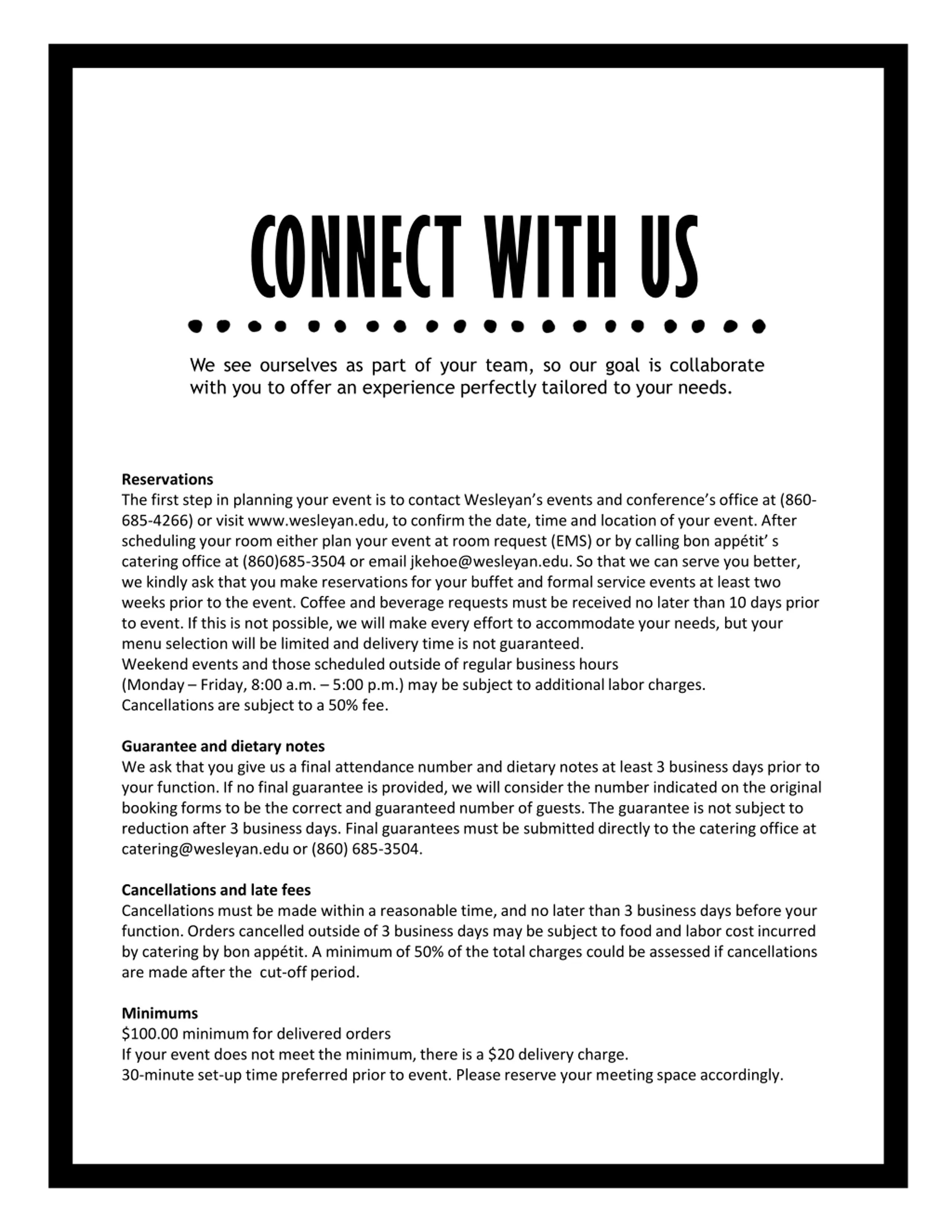 CONNECT WITH US We see ourselves as part of your team, so our goal is collaborate with you to offer an experience perfectly tailored to your needs. Reservations The first step in planning your event is to contact Wesleyan s events and conference s office at (860- 685-4266) or visit www.wesleyan.edu, to confirm the date, time and location of your event. After scheduling your room either plan your event at room request (EMS) or by calling bon app tit s catering office at (860)685-3504 or email jkehoe@wesleyan.edu. So that we can serve you better, we kindly ask that you make reservations for your buffet and formal service events at least two weeks prior to the event. Coffee and beverage requests must be received no later than 10 days prior to event. If this is not possible, we will make every effort to accommodate your needs, but your menu selection will be limited and delivery time is not guaranteed. Weekend events and those scheduled outside of regular business hours (Monday Friday, 8:00 a.m. 5:00 p.m.) may be subject to additional labor charges. Cancellations are subject to a 50% fee. Guarantee and dietary notes We ask that you give us a final attendance number and dietary notes at least 3 business days prior to your function. If no final guarantee is provided, we will consider the number indicated on the original booking forms to be the correct and guaranteed number of guests. The guarantee is not subject to reduction after 3 business days. Final guarantees must be submitted directly to the catering office at catering@wesleyan.edu or (860) 685-3504. Cancellations and late fees Cancellations must be made within a reasonable time, and no later than 3 business days before your function. Orders cancelled outside of 3 business days may be subject to food and labor cost incurred by catering by bon app tit. A minimum of 50% of the total charges could be assessed if cancellations are made after the cut-off period. Minimums $100.00 minimum for delivered orders If your event does not meet the minimum, there is a $20 delivery charge. 30-minute set-up time preferred prior to event. Please reserve your meeting space accordingly.
