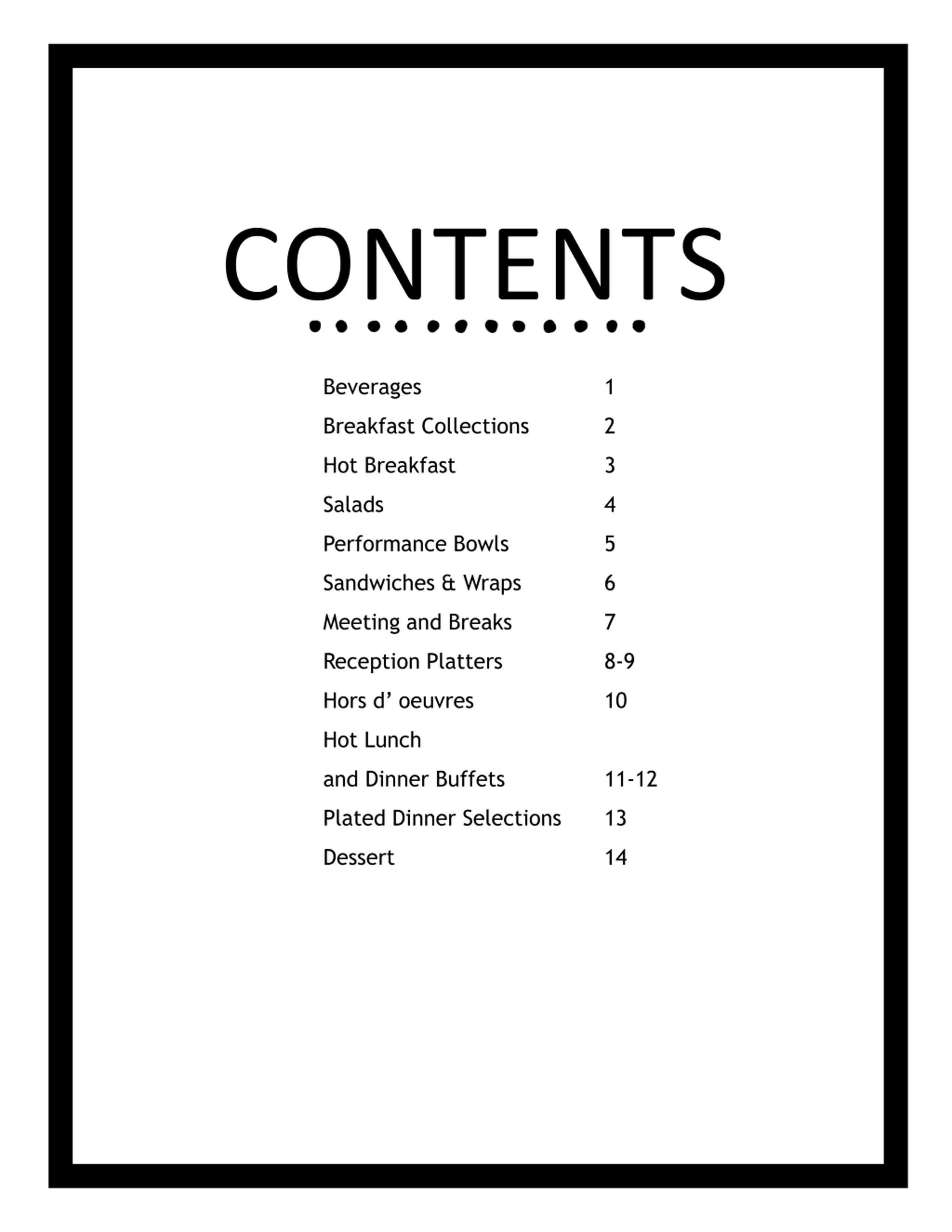 CONTENTS Beverages 1 Breakfast Collections 2 Hot Breakfast 3 Salads 4 Performance Bowls 5 Sandwiches & Wraps 6 Meeting and Breaks 7 Reception Platters 8-9 Hors d oeuvres 10 Hot Lunch and Dinner Buffets 11-12 Plated Dinner Selections 13 Dessert 14