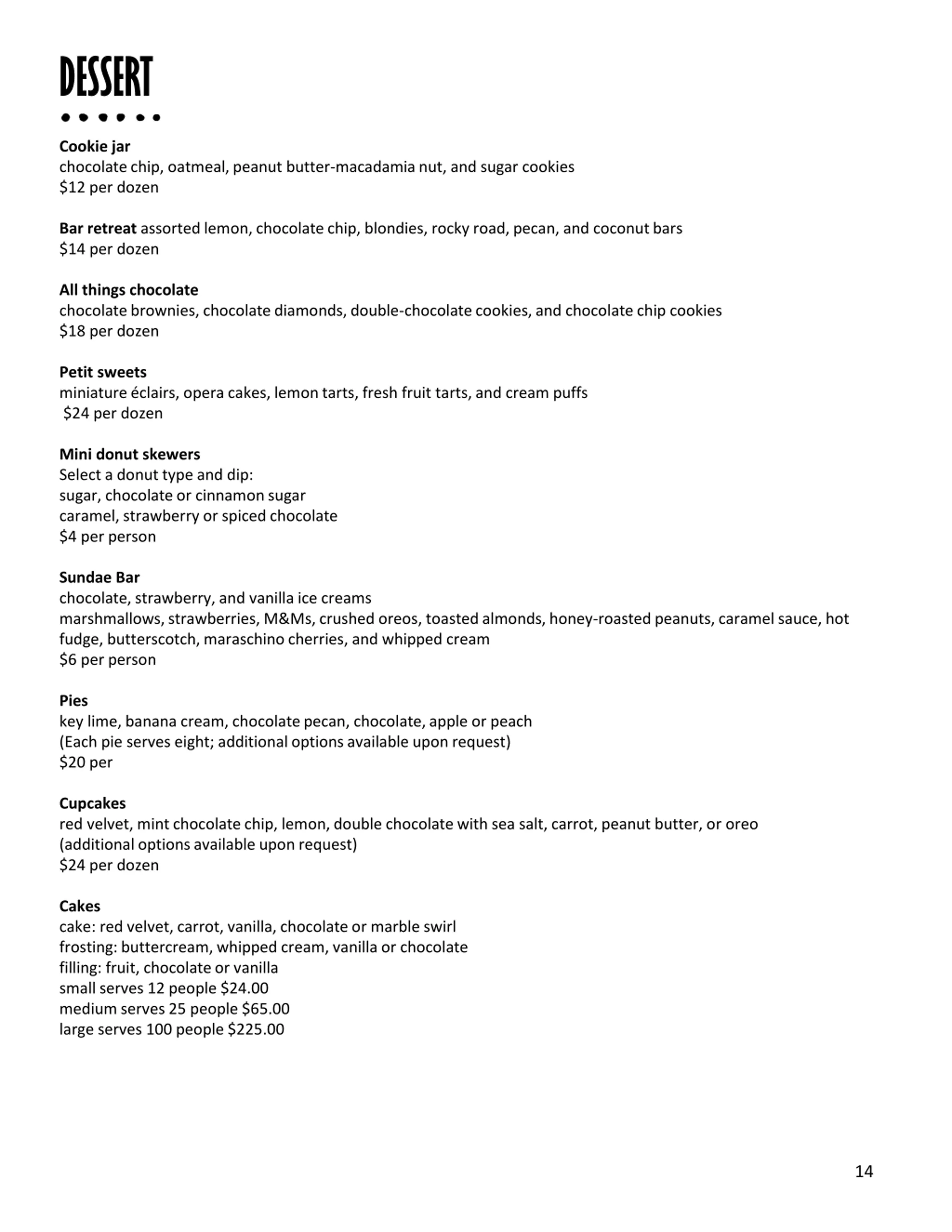 DESSERT Cookie jar chocolate chip, oatmeal, peanut butter-macadamia nut, and sugar cookies $12 per dozen Bar retreat assorted lemon, chocolate chip, blondies, rocky road, pecan, and coconut bars $14 per dozen All things chocolate chocolate brownies, chocolate diamonds, double-chocolate cookies, and chocolate chip cookies $18 per dozen Petit sweets miniature clairs, opera cakes, lemon tarts, fresh fruit tarts, and cream puffs $24 per dozen Mini donut skewers Select a donut type and dip: sugar, chocolate or cinnamon sugar caramel, strawberry or spiced chocolate $4 per person Sundae Bar chocolate, strawberry, and vanilla ice creams marshmallows, strawberries, M&Ms, crushed oreos, toasted almonds, honey-roasted peanuts, caramel sauce, hot fudge, butterscotch, maraschino cherries, and whipped cream $6 per person Pies key lime, banana cream, chocolate pecan, chocolate, apple or peach (Each pie serves eight; additional options available upon request) $20 per Cupcakes red velvet, mint chocolate chip, lemon, double chocolate with sea salt, carrot, peanut butter, or oreo (additional options available upon request) $24 per dozen Cakes cake: red velvet, carrot, vanilla, chocolate or marble swirl frosting: buttercream, whipped cream, vanilla or chocolate filling: fruit, chocolate or vanilla small serves 12 people $24.00 medium serves 25 people $65.00 large serves 100 people $225.00 14