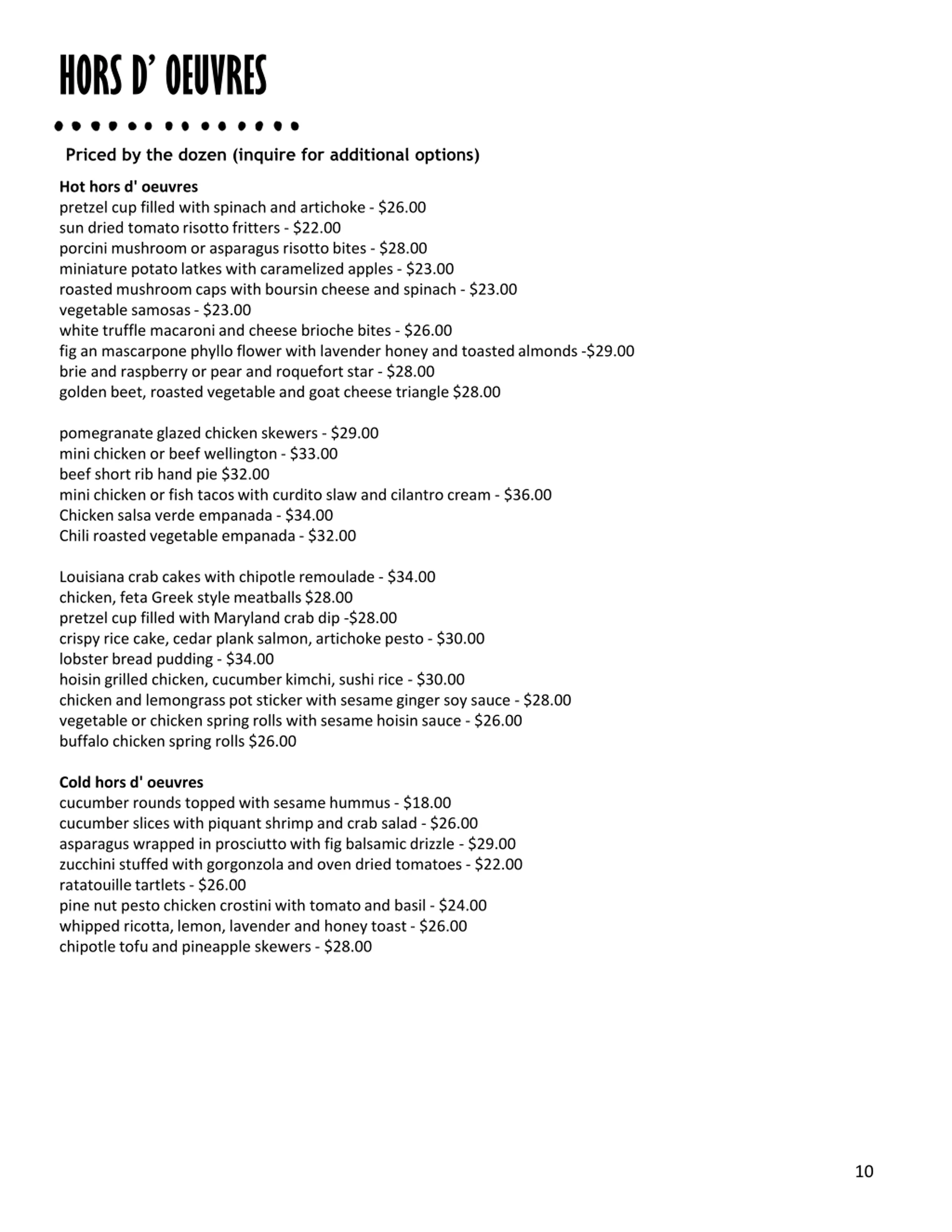 HORS D OEUVRES Priced by the dozen (inquire for additional options) Hot hors d' oeuvres pretzel cup filled with spinach and artichoke - $26.00 sun dried tomato risotto fritters - $22.00 porcini mushroom or asparagus risotto bites - $28.00 miniature potato latkes with caramelized apples - $23.00 roasted mushroom caps with boursin cheese and spinach - $23.00 vegetable samosas - $23.00 white truffle macaroni and cheese brioche bites - $26.00 fig an mascarpone phyllo flower with lavender honey and toasted almonds -$29.00 brie and raspberry or pear and roquefort star - $28.00 golden beet, roasted vegetable and goat cheese triangle $28.00 pomegranate glazed chicken skewers - $29.00 mini chicken or beef wellington - $33.00 beef short rib hand pie $32.00 mini chicken or fish tacos with curdito slaw and cilantro cream - $36.00 Chicken salsa verde empanada - $34.00 Chili roasted vegetable empanada - $32.00 Louisiana crab cakes with chipotle remoulade - $34.00 chicken, feta Greek style meatballs $28.00 pretzel cup filled with Maryland crab dip -$28.00 crispy rice cake, cedar plank salmon, artichoke pesto - $30.00 lobster bread pudding - $34.00 hoisin grilled chicken, cucumber kimchi, sushi rice - $30.00 chicken and lemongrass pot sticker with sesame ginger soy sauce - $28.00 vegetable or chicken spring rolls with sesame hoisin sauce - $26.00 buffalo chicken spring rolls $26.00 Cold hors d' oeuvres cucumber rounds topped with sesame hummus - $18.00 cucumber slices with piquant shrimp and crab salad - $26.00 asparagus wrapped in prosciutto with fig balsamic drizzle - $29.00 zucchini stuffed with gorgonzola and oven dried tomatoes - $22.00 ratatouille tartlets - $26.00 pine nut pesto chicken crostini with tomato and basil - $24.00 whipped ricotta, lemon, lavender and honey toast - $26.00 chipotle tofu and pineapple skewers - $28.00 10