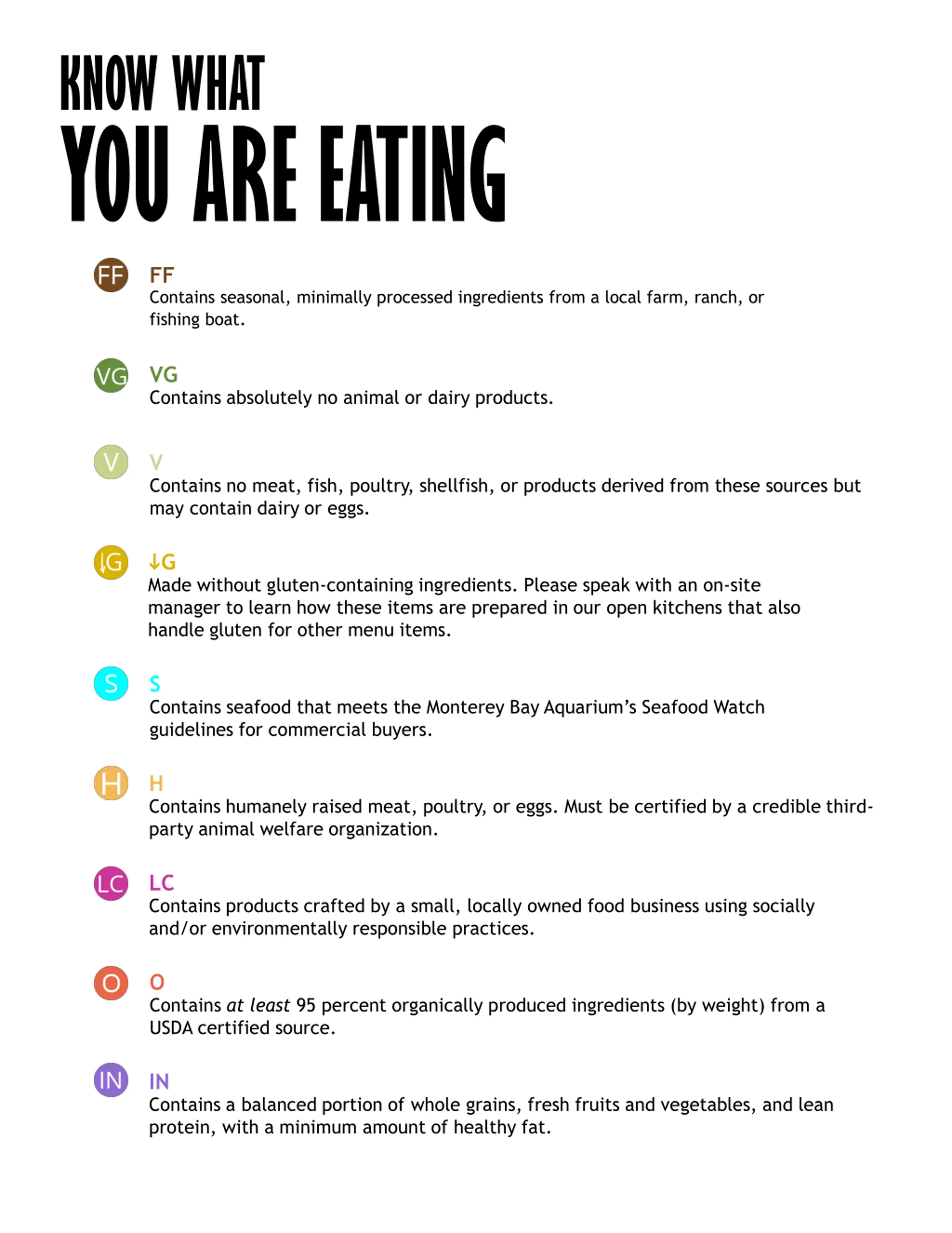 KNOW WHAT YOU ARE EATING FF Contains seasonal, minimally processed ingredients from a local farm, ranch, or fishing boat. VG Contains absolutely no animal or dairy products. V Contains no meat, fish, poultry, shellfish, or products derived from these sources but may contain dairy or eggs. G Made without gluten-containing ingredients. Please speak with an on-site manager to learn how these items are prepared in our open kitchens that also handle gluten for other menu items. S Contains seafood that meets the Monterey Bay Aquarium s Seafood Watch guidelines for commercial buyers. H Contains humanely raised meat, poultry, or eggs. Must be certified by a credible third- party animal welfare organization. LC Contains products crafted by a small, locally owned food business using socially and/or environmentally responsible practices. O Contains at least 95 percent organically produced ingredients (by weight) from a USDA certified source. IN Contains a balanced portion of whole grains, fresh fruits and vegetables, and lean protein, with a minimum amount of healthy fat.