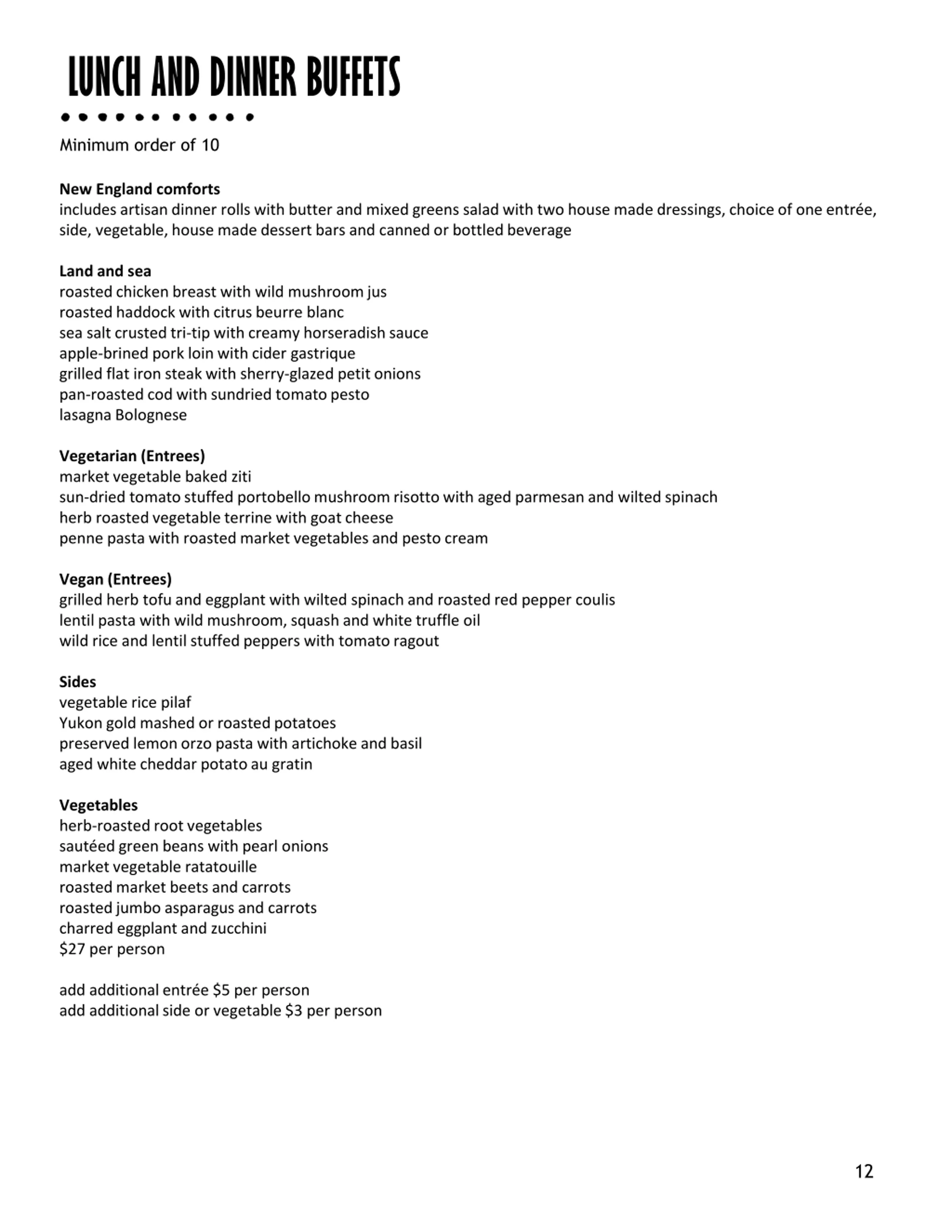 LUNCH AND DINNER BUFFETS Minimum order of 10 New England comforts includes artisan dinner rolls with butter and mixed greens salad with two house made dressings, choice of one entr e, side, vegetable, house made dessert bars and canned or bottled beverage Land and sea roasted chicken breast with wild mushroom jus roasted haddock with citrus beurre blanc sea salt crusted tri-tip with creamy horseradish sauce apple-brined pork loin with cider gastrique grilled flat iron steak with sherry-glazed petit onions pan-roasted cod with sundried tomato pesto lasagna Bolognese Vegetarian (Entrees) market vegetable baked ziti sun-dried tomato stuffed portobello mushroom risotto with aged parmesan and wilted spinach herb roasted vegetable terrine with goat cheese penne pasta with roasted market vegetables and pesto cream Vegan (Entrees) grilled herb tofu and eggplant with wilted spinach and roasted red pepper coulis lentil pasta with wild mushroom, squash and white truffle oil wild rice and lentil stuffed peppers with tomato ragout Sides vegetable rice pilaf Yukon gold mashed or roasted potatoes preserved lemon orzo pasta with artichoke and basil aged white cheddar potato au gratin Vegetables herb-roasted root vegetables saut ed green beans with pearl onions market vegetable ratatouille roasted market beets and carrots roasted jumbo asparagus and carrots charred eggplant and zucchini $27 per person add additional entr e $5 per person add additional side or vegetable $3 per person 12