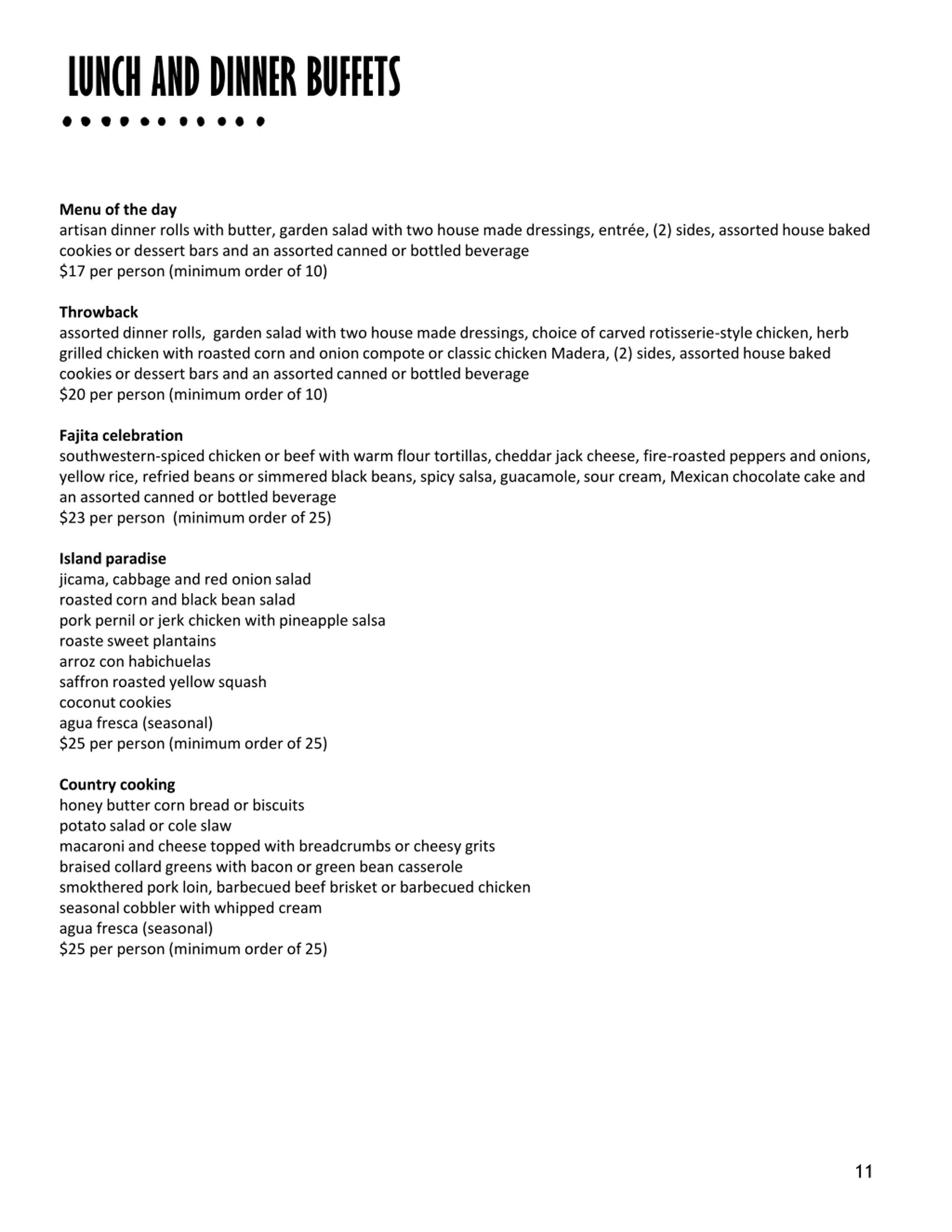 LUNCH AND DINNER BUFFETS Menu of the day artisan dinner rolls with butter, garden salad with two house made dressings, entr e, (2) sides, assorted house baked cookies or dessert bars and an assorted canned or bottled beverage $17 per person (minimum order of 10) Throwback assorted dinner rolls, garden salad with two house made dressings, choice of carved rotisserie-style chicken, herb grilled chicken with roasted corn and onion compote or classic chicken Madera, (2) sides, assorted house baked cookies or dessert bars and an assorted canned or bottled beverage $20 per person (minimum order of 10) Fajita celebration southwestern-spiced chicken or beef with warm flour tortillas, cheddar jack cheese, fire-roasted peppers and onions, yellow rice, refried beans or simmered black beans, spicy salsa, guacamole, sour cream, Mexican chocolate cake and an assorted canned or bottled beverage $23 per person (minimum order of 25) Island paradise jicama, cabbage and red onion salad roasted corn and black bean salad pork pernil or jerk chicken with pineapple salsa roaste sweet plantains arroz con habichuelas saffron roasted yellow squash coconut cookies agua fresca (seasonal) $25 per person (minimum order of 25) Country cooking honey butter corn bread or biscuits potato salad or cole slaw macaroni and cheese topped with breadcrumbs or cheesy grits braised collard greens with bacon or green bean casserole smokthered pork loin, barbecued beef brisket or barbecued chicken seasonal cobbler with whipped cream agua fresca (seasonal) $25 per person (minimum order of 25) 11