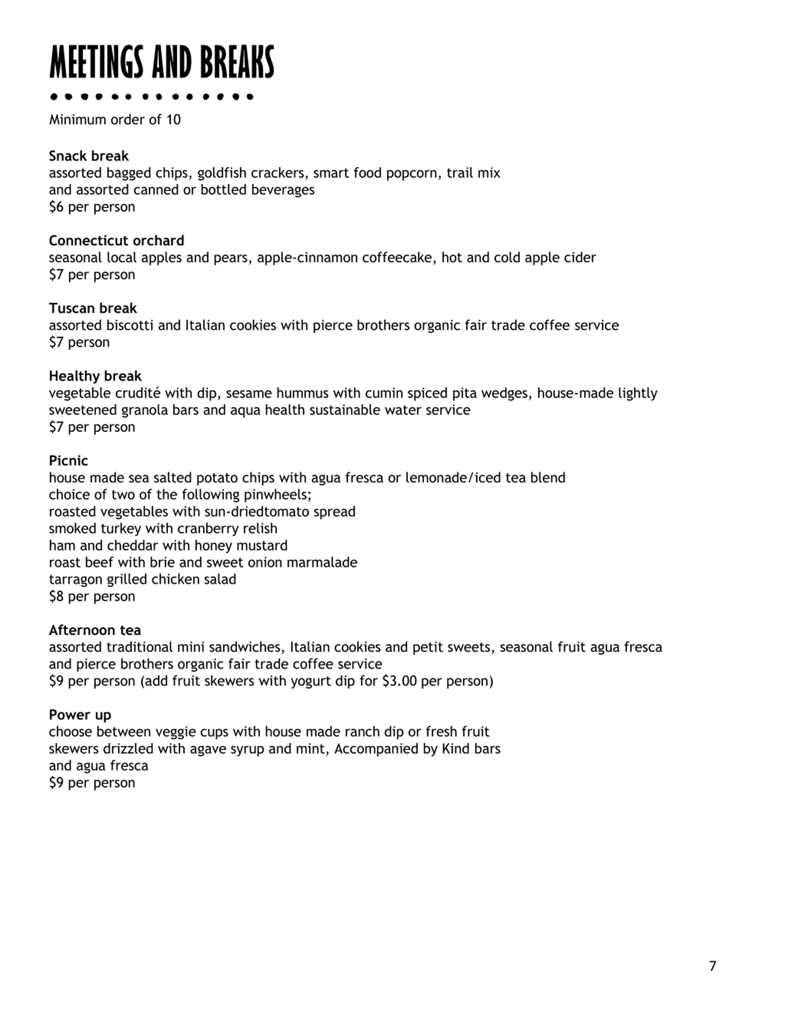 MEETINGS AND BREAKS Minimum order of 10 Snack break assorted bagged chips, goldfish crackers, smart food popcorn, trail mix and assorted canned or bottled beverages $6 per person Connecticut orchard seasonal local apples and pears, apple-cinnamon coffeecake, hot and cold apple cider $7 per person Tuscan break assorted biscotti and Italian cookies with pierce brothers organic fair trade coffee service $7 person Healthy break vegetable crudit with dip, sesame hummus with cumin spiced pita wedges, house-made lightly sweetened granola bars and aqua health sustainable water service $7 per person Picnic house made sea salted potato chips with agua fresca or lemonade/iced tea blend choice of two of the following pinwheels; roasted vegetables with sun-driedtomato spread smoked turkey with cranberry relish ham and cheddar with honey mustard roast beef with brie and sweet onion marmalade tarragon grilled chicken salad $8 per person Afternoon tea assorted traditional mini sandwiches, Italian cookies and petit sweets, seasonal fruit agua fresca and pierce brothers organic fair trade coffee service $9 per person (add fruit skewers with yogurt dip for $3.00 per person) Power up choose between veggie cups with house made ranch dip or fresh fruit skewers drizzled with agave syrup and mint, Accompanied by Kind bars and agua fresca $9 per person 7