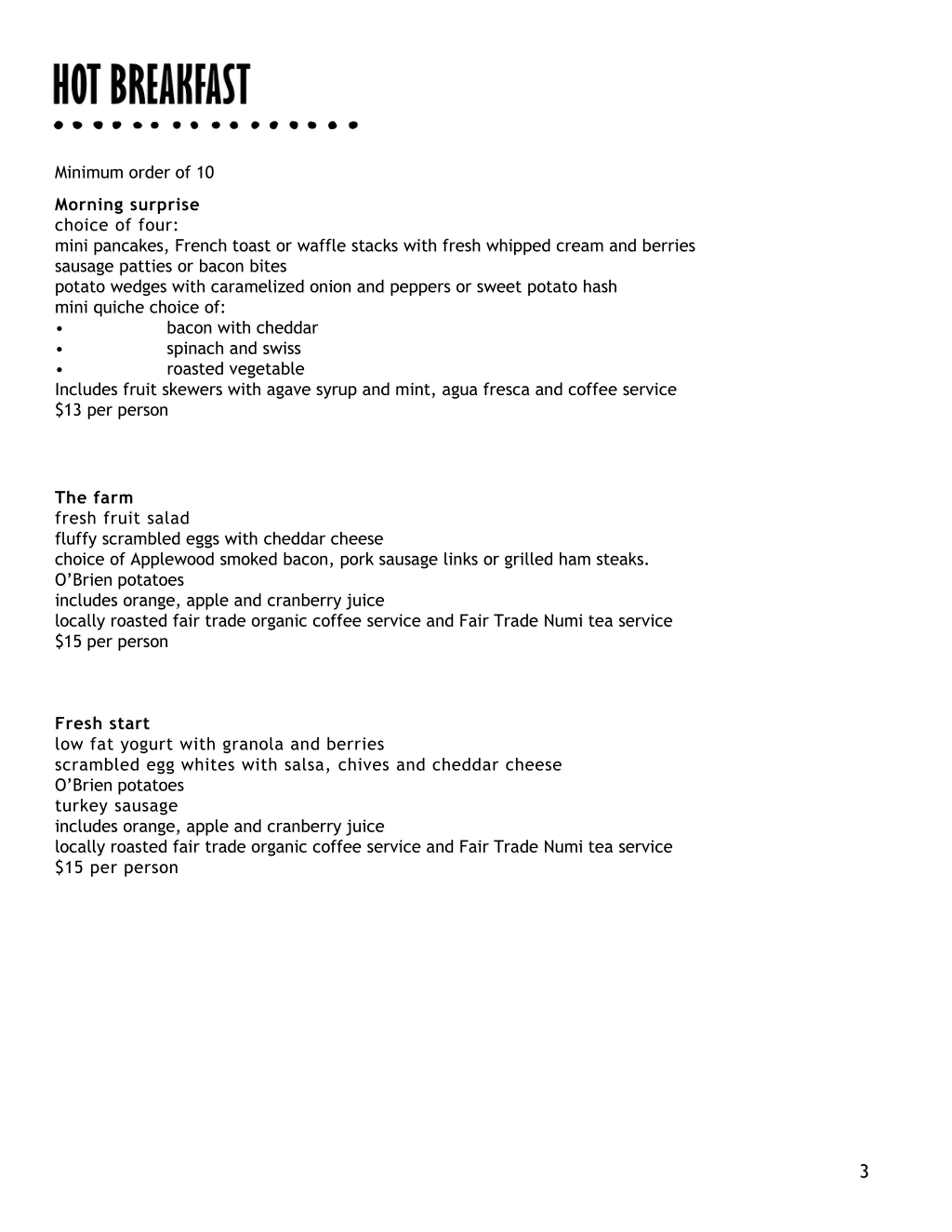Minimum order of 10 Morning surprise choice of four: mini pancakes, French toast or waffle stacks with fresh whipped cream and berries sausage patties or bacon bites potato wedges with caramelized onion and peppers or sweet potato hash mini quiche choice of: bacon with cheddar spinach and swiss roasted vegetable Includes fruit skewers with agave syrup and mint, agua fresca and coffee service $13 per person The farm fresh fruit salad fluffy scrambled eggs with cheddar cheese choice of Applewood smoked bacon, pork sausage links or grilled ham steaks. O Brien potatoes includes orange, apple and cranberry juice locally roasted fair trade organic coffee service and Fair Trade Numi tea service $15 per person Fresh start low fat yogurt with granola and berries scrambled egg whites with salsa, chives and cheddar cheese O Brien potatoes turkey sausage includes orange, apple and cranberry juice locally roasted fair trade organic coffee service and Fair Trade Numi tea service $15 per person 3