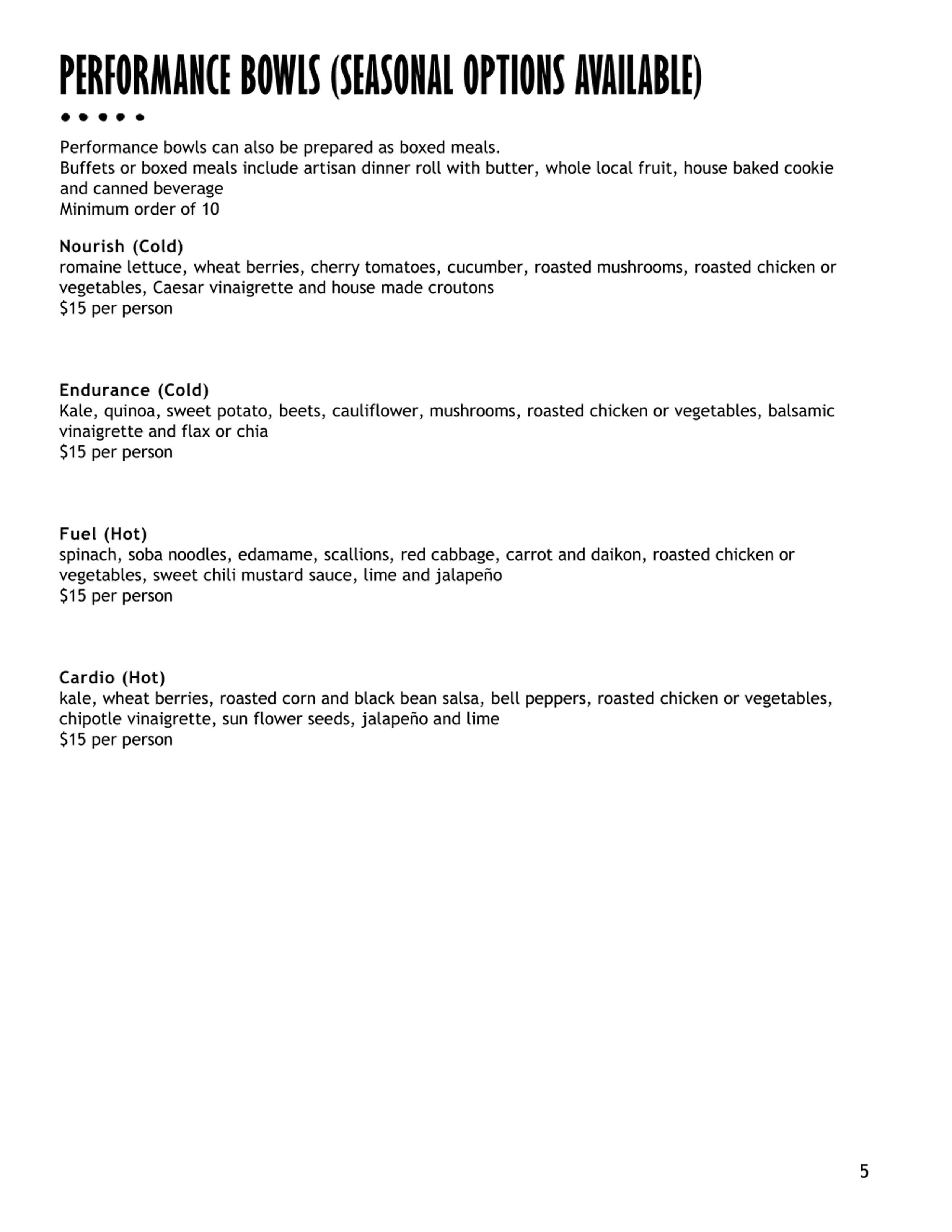 PERFORMANCE BOWLS (SEASONAL OPTIONS AVAILABLE) Performance bowls can also be prepared as boxed meals. Buffets or boxed meals include artisan dinner roll with butter, whole local fruit, house baked cookie and canned beverage Minimum order of 10 Nourish (Cold) romaine lettuce, wheat berries, cherry tomatoes, cucumber, roasted mushrooms, roasted chicken or vegetables, Caesar vinaigrette and house made croutons $15 per person Endurance (Cold) Kale, quinoa, sweet potato, beets, cauliflower, mushrooms, roasted chicken or vegetables, balsamic vinaigrette and flax or chia $15 per person Fuel (Hot) spinach, soba noodles, edamame, scallions, red cabbage, carrot and daikon, roasted chicken or vegetables, sweet chili mustard sauce, lime and jalape o $15 per person Cardio (Hot) kale, wheat berries, roasted corn and black bean salsa, bell peppers, roasted chicken or vegetables, chipotle vinaigrette, sun flower seeds, jalape o and lime $15 per person 5