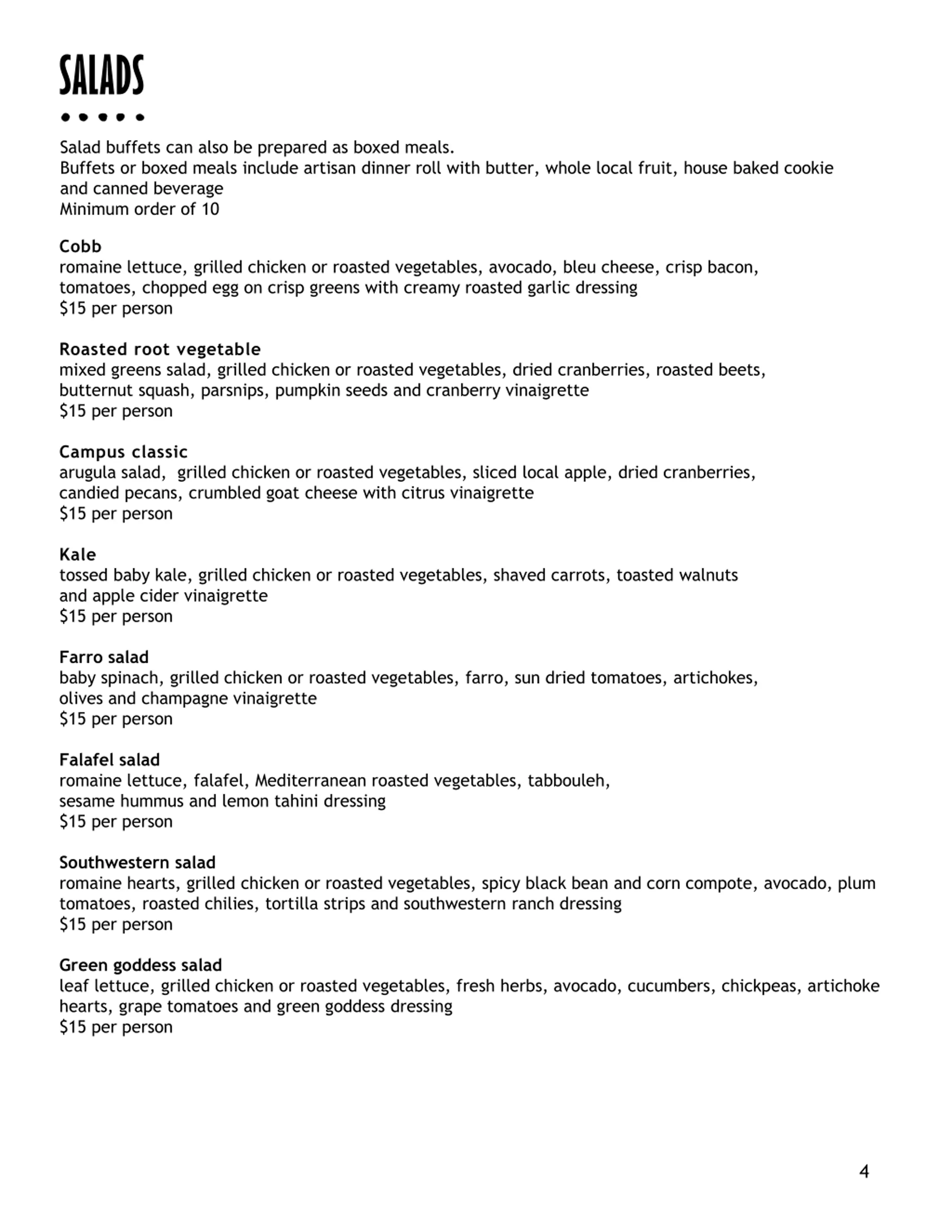 SALADS Salad buffets can also be prepared as boxed meals. Buffets or boxed meals include artisan dinner roll with butter, whole local fruit, house baked cookie and canned beverage Minimum order of 10 Cobb romaine lettuce, grilled chicken or roasted vegetables, avocado, bleu cheese, crisp bacon, tomatoes, chopped egg on crisp greens with creamy roasted garlic dressing $15 per person Roasted root vegetable mixed greens salad, grilled chicken or roasted vegetables, dried cranberries, roasted beets, butternut squash, parsnips, pumpkin seeds and cranberry vinaigrette $15 per person Campus classic arugula salad, grilled chicken or roasted vegetables, sliced local apple, dried cranberries, candied pecans, crumbled goat cheese with citrus vinaigrette $15 per person Kale tossed baby kale, grilled chicken or roasted vegetables, shaved carrots, toasted walnuts and apple cider vinaigrette $15 per person Farro salad baby spinach, grilled chicken or roasted vegetables, farro, sun dried tomatoes, artichokes, olives and champagne vinaigrette $15 per person Falafel salad romaine lettuce, falafel, Mediterranean roasted vegetables, tabbouleh, sesame hummus and lemon tahini dressing $15 per person Southwestern salad romaine hearts, grilled chicken or roasted vegetables, spicy black bean and corn compote, avocado, plum tomatoes, roasted chilies, tortilla strips and southwestern ranch dressing $15 per person Green goddess salad leaf lettuce, grilled chicken or roasted vegetables, fresh herbs, avocado, cucumbers, chickpeas, artichoke hearts, grape tomatoes and green goddess dressing $15 per person 4