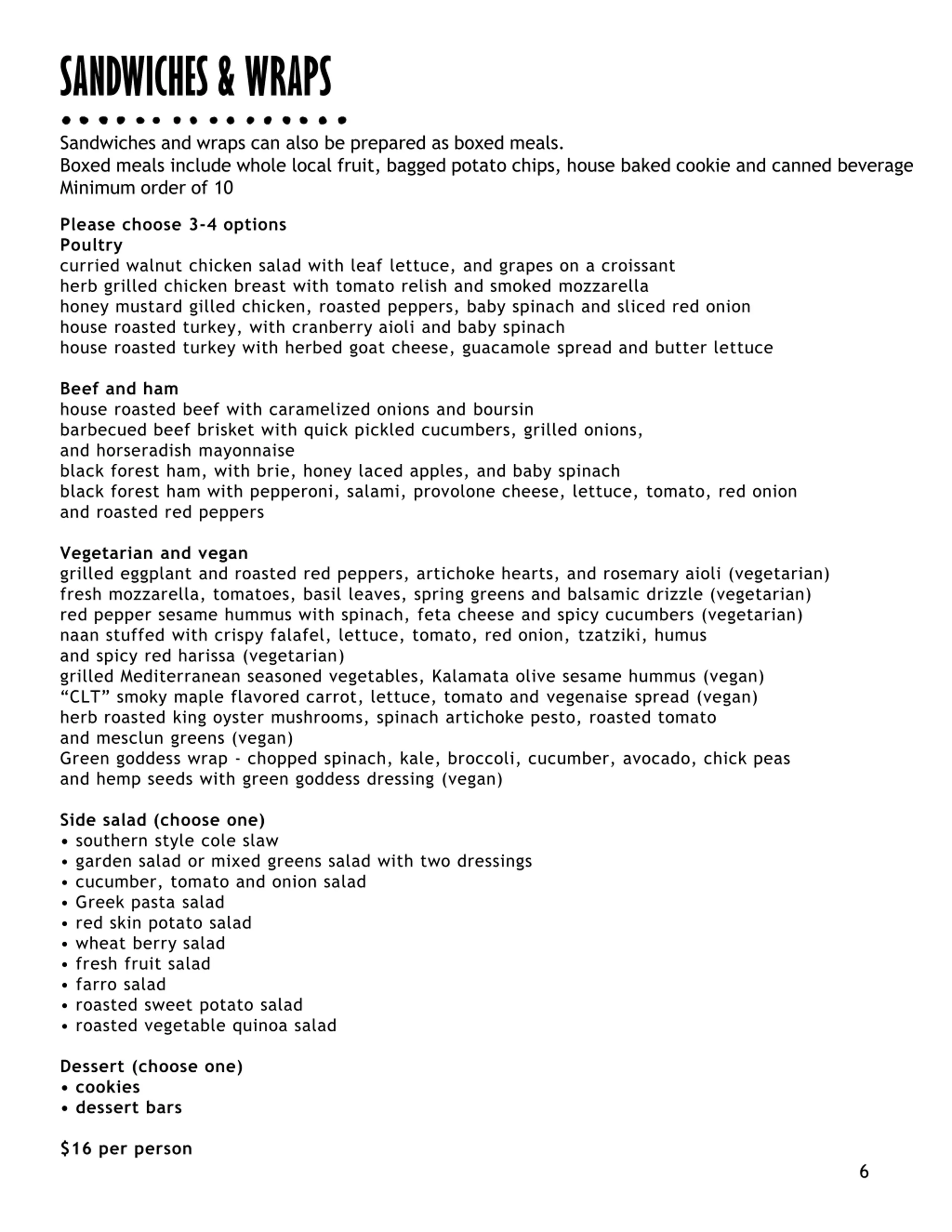 SANDWICHES & WRAPS Sandwiches and wraps can also be prepared as boxed meals. Boxed meals include whole local fruit, bagged potato chips, house baked cookie and canned beverage Minimum order of 10 Please choose 3-4 options Poultry curried walnut chicken salad with leaf lettuce, and grapes on a croissant herb grilled chicken breast with tomato relish and smoked mozzarella honey mustard gilled chicken, roasted peppers, baby spinach and sliced red onion house roasted turkey, with cranberry aioli and baby spinach house roasted turkey with herbed goat cheese, guacamole spread and butter lettuce Beef and ham house roasted beef with caramelized onions and boursin barbecued beef brisket with quick pickled cucumbers, grilled onions, and horseradish mayonnaise black forest ham, with brie, honey laced apples, and baby spinach black forest ham with pepperoni, salami, provolone cheese, lettuce, tomato, red onion and roasted red peppers Vegetarian and vegan grilled eggplant and roasted red peppers, artichoke hearts, and rosemary aioli (vegetarian) fresh mozzarella, tomatoes, basil leaves, spring greens and balsamic drizzle (vegetarian) red pepper sesame hummus with spinach, feta cheese and spicy cucumbers (vegetarian) naan stuffed with crispy falafel, lettuce, tomato, red onion, tzatziki, humus and spicy red harissa (vegetarian) grilled Mediterranean seasoned vegetables, Kalamata olive sesame hummus (vegan) CLT smoky maple flavored carrot, lettuce, tomato and vegenaise spread (vegan) herb roasted king oyster mushrooms, spinach artichoke pesto, roasted tomato and mesclun greens (vegan) Green goddess wrap - chopped spinach, kale, broccoli, cucumber, avocado, chick peas and hemp seeds with green goddess dressing (vegan) Side salad (choose one) southern style cole slaw garden salad or mixed greens salad with two dressings cucumber, tomato and onion salad Greek pasta salad red skin potato salad wheat berry salad fresh fruit salad farro salad roasted sweet potato salad roasted vegetable quinoa salad Dessert (choose one) cookies dessert bars $16 per person 6