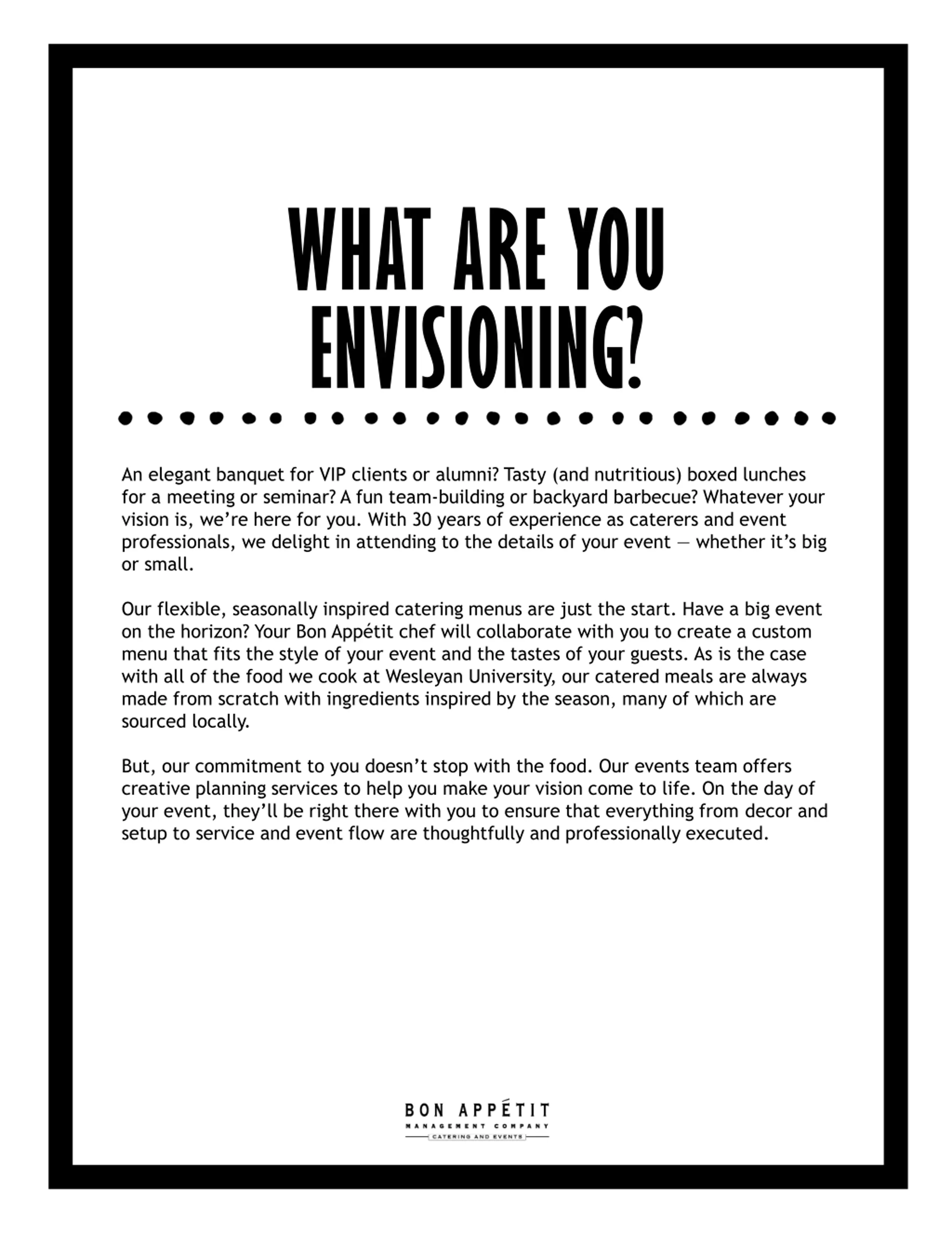 WHAT ARE YOU ENVISIONING? An elegant banquet for VIP clients or alumni? Tasty (and nutritious) boxed lunches for a meeting or seminar? A fun team-building or backyard barbecue? Whatever your vision is, we re here for you. With 30 years of experience as caterers and event professionals, we delight in attending to the details of your event whether it s big or small. Our flexible, seasonally inspired catering menus are just the start. Have a big event on the horizon? Your Bon App tit chef will collaborate with you to create a custom menu that fits the style of your event and the tastes of your guests. As is the case with all of the food we cook at Wesleyan University, our catered meals are always made from scratch with ingredients inspired by the season, many of which are sourced locally. But, our commitment to you doesn t stop with the food. Our events team offers creative planning services to help you make your vision come to life. On the day of your event, they ll be right there with you to ensure that everything from decor and setup to service and event flow are thoughtfully and professionally executed.