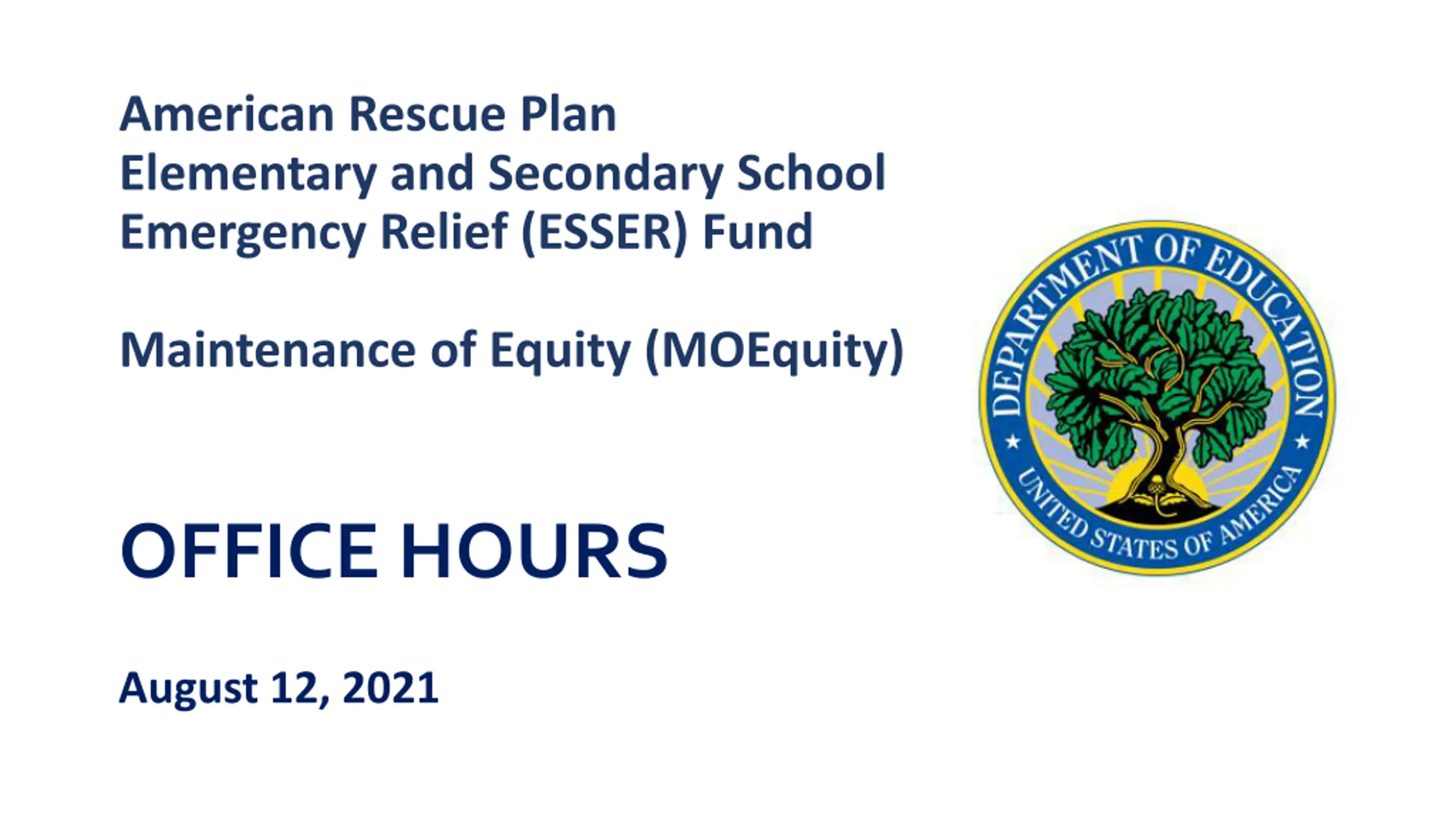 American Rescue Plan Elementary and Secondary School Emergency Relief (ESSER) Fund Maintenance of Equity (MOEquity) OFFICE HOURS August 12, 2021