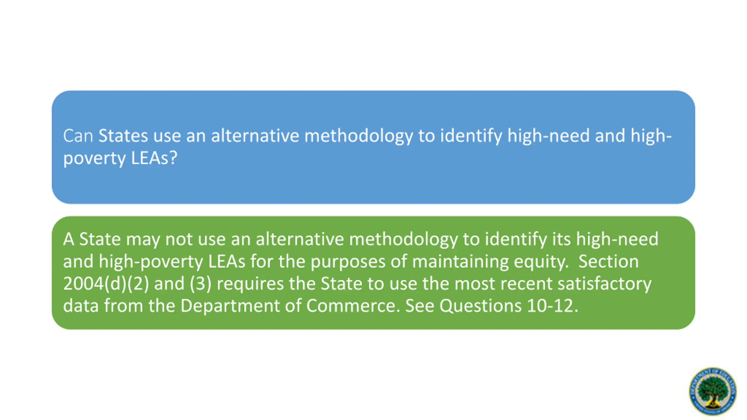 Can States use an alternative methodology to identify high-need and high- poverty LEAs? A State may not use an alternative methodology to identify its high-need and high-poverty LEAs for the purposes of maintaining equity. Section 2004(d)(2) and (3) requires the State to use the most recent satisfactory data from the Department of Commerce. See Questions 10-12.