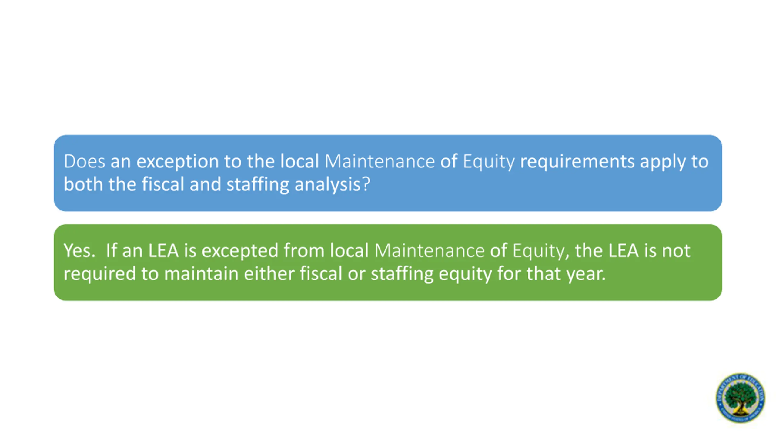 Does an exception to the local Maintenance of Equity requirements apply to both the fiscal and staffing analysis? Yes. If an LEA is excepted from local Maintenance of Equity, the LEA is not required to maintain either fiscal or staffing equity for that year.