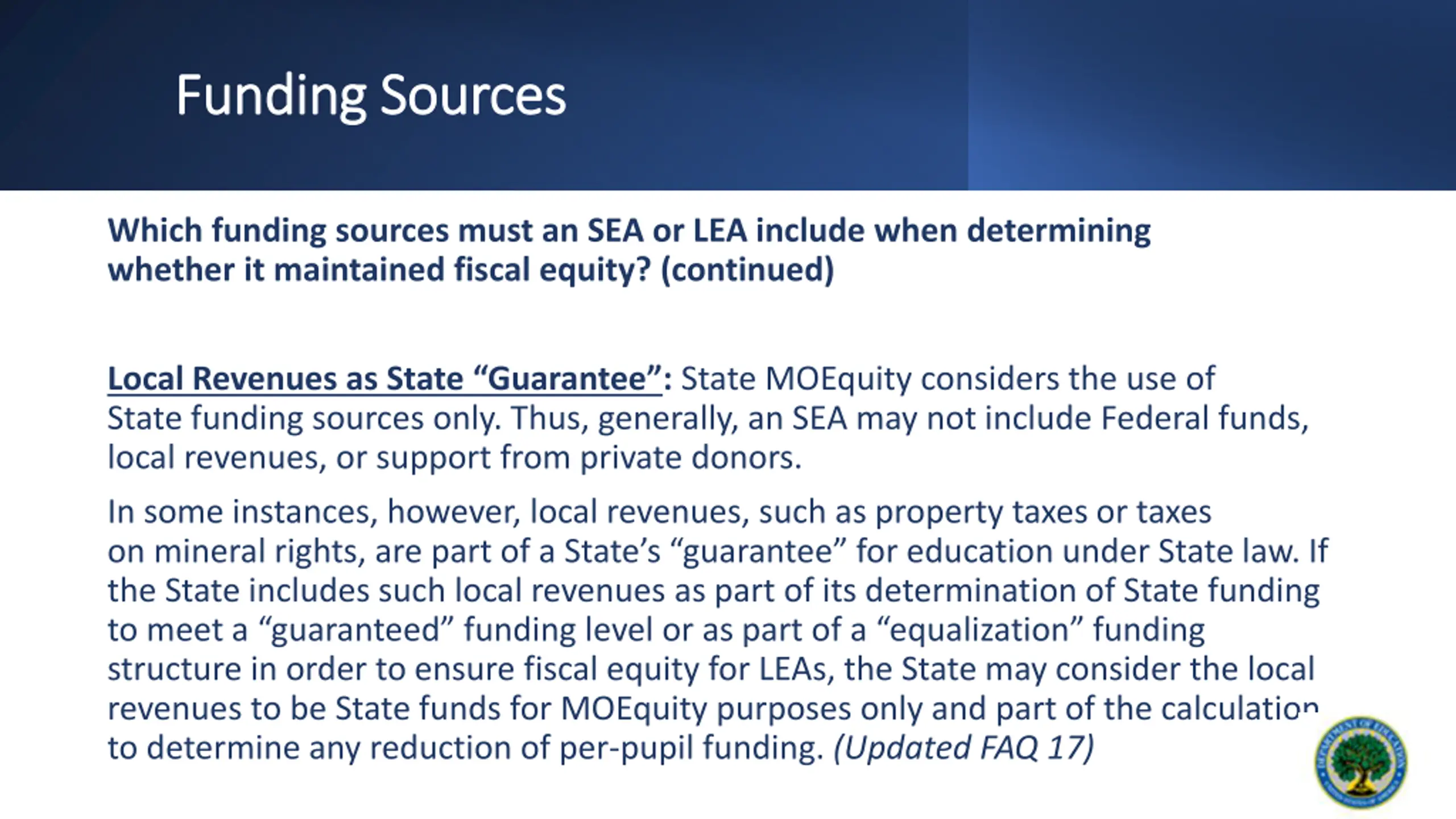 Funding Sources Funding Sources Which funding sources must an SEA or LEA include when determining whether it maintained fiscal equity? (continued) Local Revenues as State Guarantee : State MOEquity considers the use of State funding sources only. Thus, generally, an SEA may not include Federal funds, local revenues, or support from private donors. In some instances, however, local revenues, such as property taxes or taxes on mineral rights, are part of a State s guarantee for education under State law. If the State includes such local revenues as part of its determination of State funding to meet a guaranteed funding level or as part of a equalization funding structure in order to ensure fiscal equity for LEAs, the State may consider the local revenues to be State funds for MOEquity purposes only and part of the calculation to determine any reduction of per-pupil funding. (Updated FAQ 17)