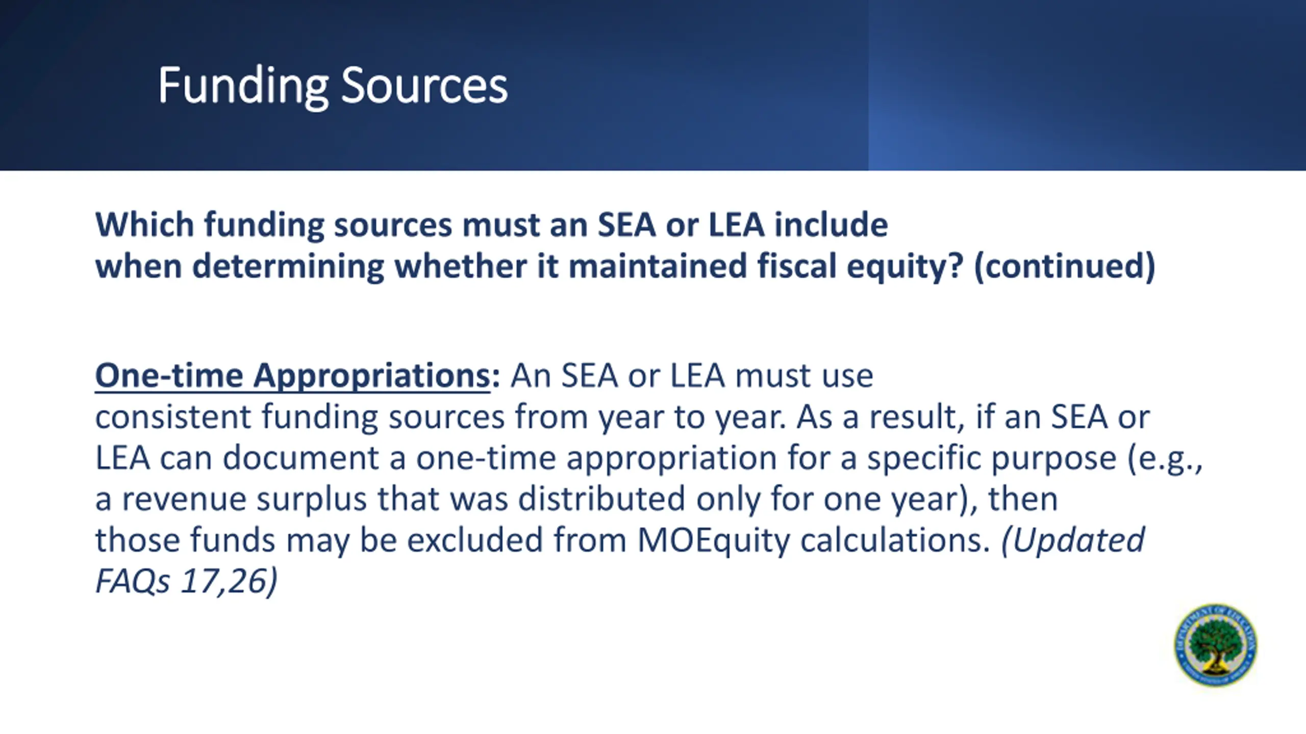 Funding Sources Funding Sources Which funding sources must an SEA or LEA include when determining whether it maintained fiscal equity? (continued) One-time Appropriations: An SEA or LEA must use consistent funding sources from year to year. As a result, if an SEA or LEA can document a one-time appropriation for a specific purpose (e.g., a revenue surplus that was distributed only for one year), then those funds may be excluded from MOEquity calculations. (Updated FAQs 17,26)