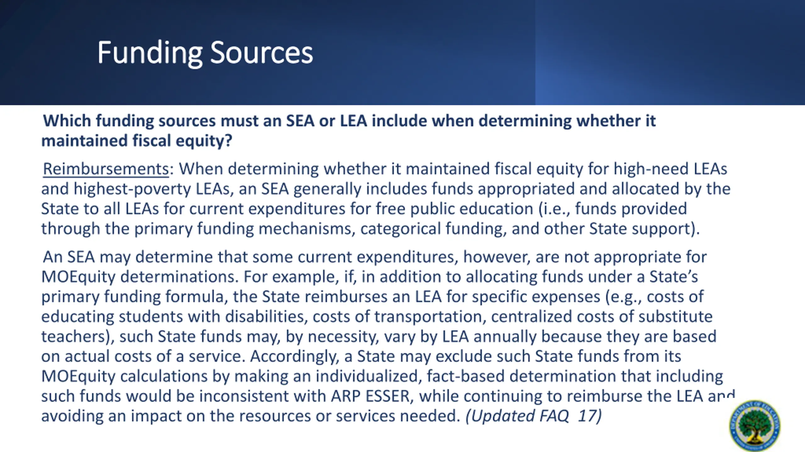 Funding Sources Funding Sources Which funding sources must an SEA or LEA include when determining whether it maintained fiscal equity? Reimbursements: When determining whether it maintained fiscal equity for high-need LEAs and highest-poverty LEAs, an SEA generally includes funds appropriated and allocated by the State to all LEAs for current expenditures for free public education (i.e., funds provided through the primary funding mechanisms, categorical funding, and other State support). An SEA may determine that some current expenditures, however, are not appropriate for MOEquity determinations. For example, if, in addition to allocating funds under a State s primary funding formula, the State reimburses an LEA for specific expenses (e.g., costs of educating students with disabilities, costs of transportation, centralized costs of substitute teachers), such State funds may, by necessity, vary by LEA annually because they are based on actual costs of a service. Accordingly, a State may exclude such State funds from its MOEquity calculations by making an individualized, fact-based determination that including such funds would be inconsistent with ARP ESSER, while continuing to reimburse the LEA and avoiding an impact on the resources or services needed. (Updated FAQ 17)