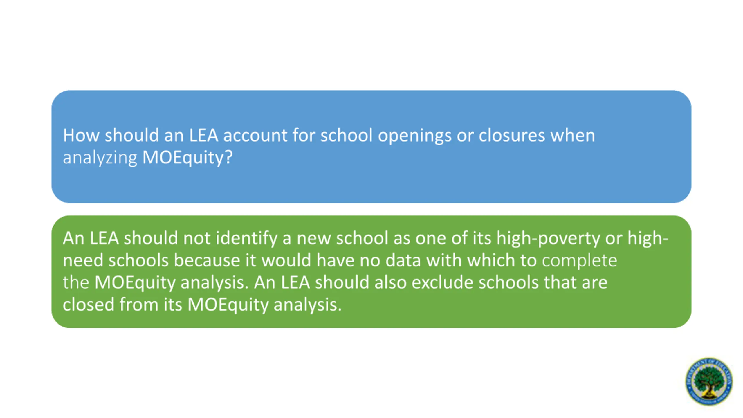 How should an LEA account for school openings or closures when analyzing MOEquity? An LEA should not identify a new school as one of its high-poverty or high- need schools because it would have no data with which to complete the MOEquity analysis. An LEA should also exclude schools that are closed from its MOEquity analysis.