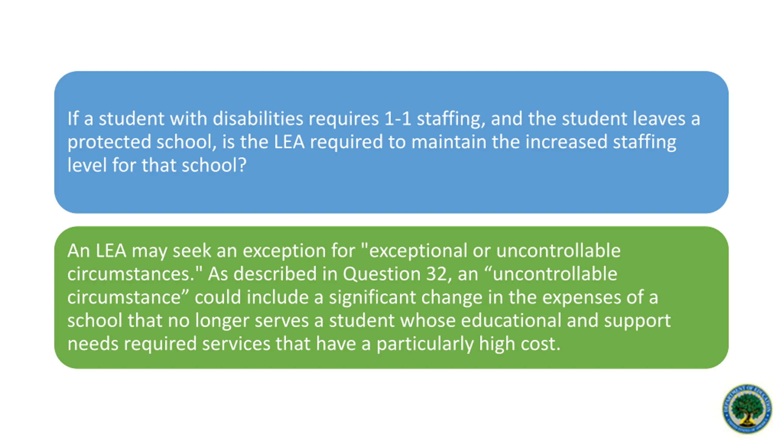 If a student with disabilities requires 1-1 staffing, and the student leaves a protected school, is the LEA required to maintain the increased staffing level for that school? An LEA may seek an exception for "exceptional or uncontrollable circumstances." As described in Question 32, an uncontrollable circumstance could include a significant change in the expenses of a school that no longer serves a student whose educational and support needs required services that have a particularly high cost.