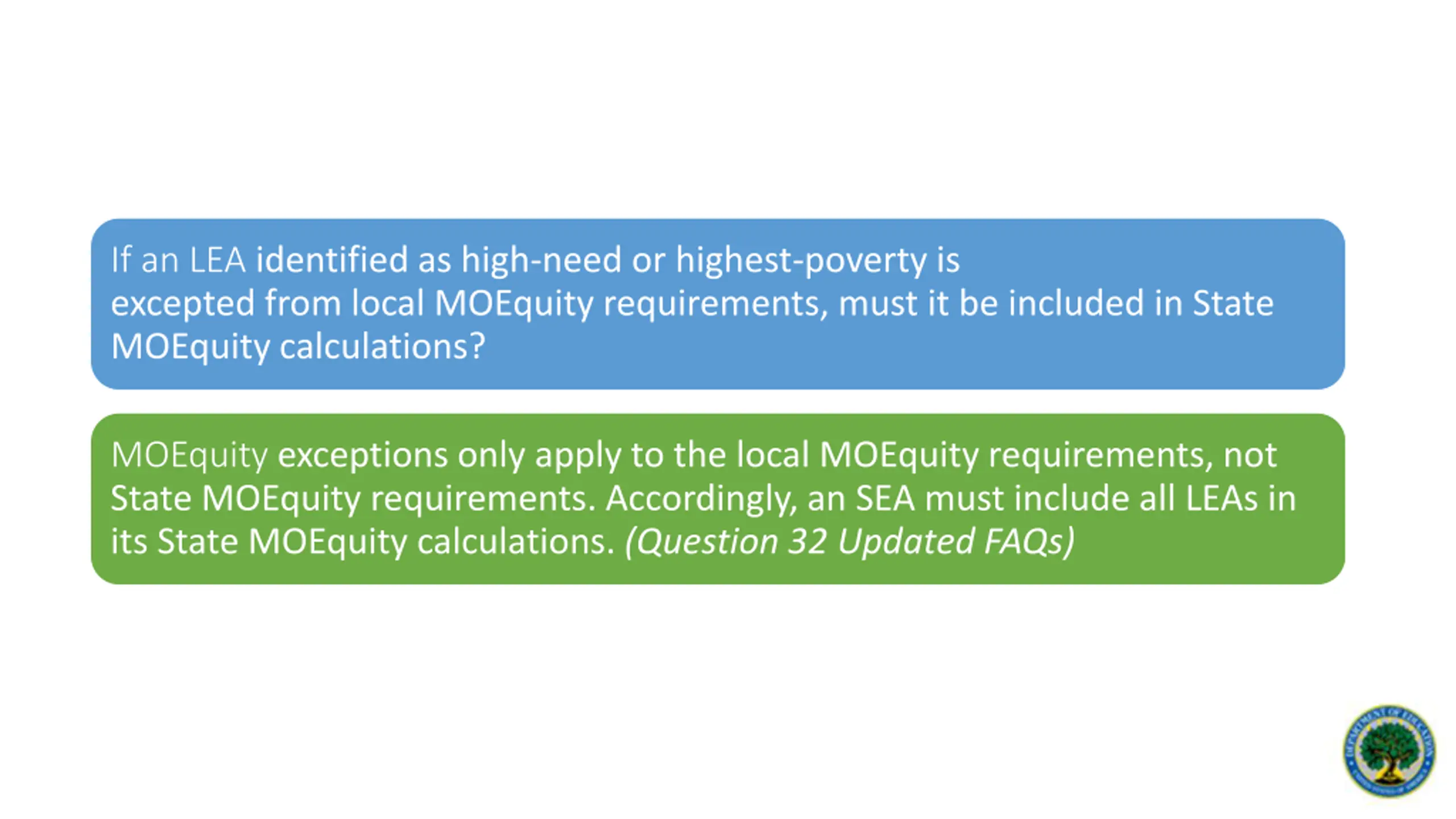 If an LEA identified as high-need or highest-poverty is excepted from local MOEquity requirements, must it be included in State MOEquity calculations? MOEquity exceptions only apply to the local MOEquity requirements, not State MOEquity requirements. Accordingly, an SEA must include all LEAs in its State MOEquity calculations. (Question 32 Updated FAQs)