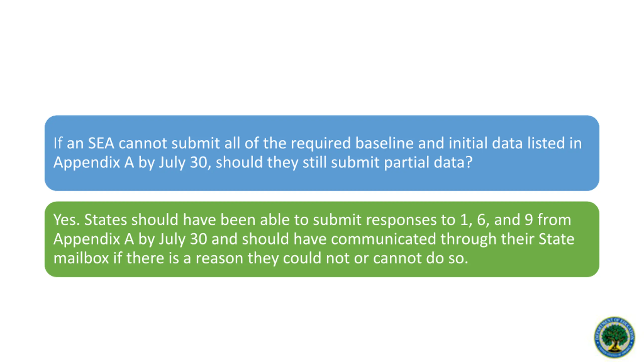 If an SEA cannot submit all of the required baseline and initial data listed in Appendix A by July 30, should they still submit partial data? Yes. States should have been able to submit responses to 1, 6, and 9 from Appendix A by July 30 and should have communicated through their State mailbox if there is a reason they could not or cannot do so.